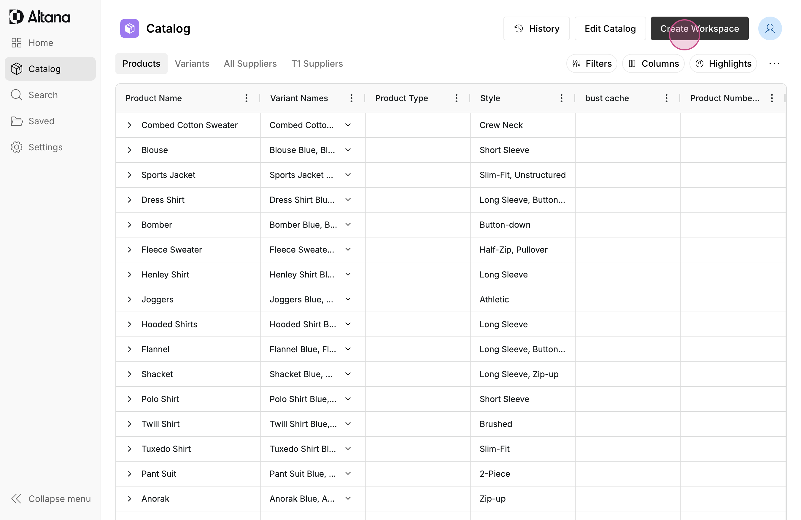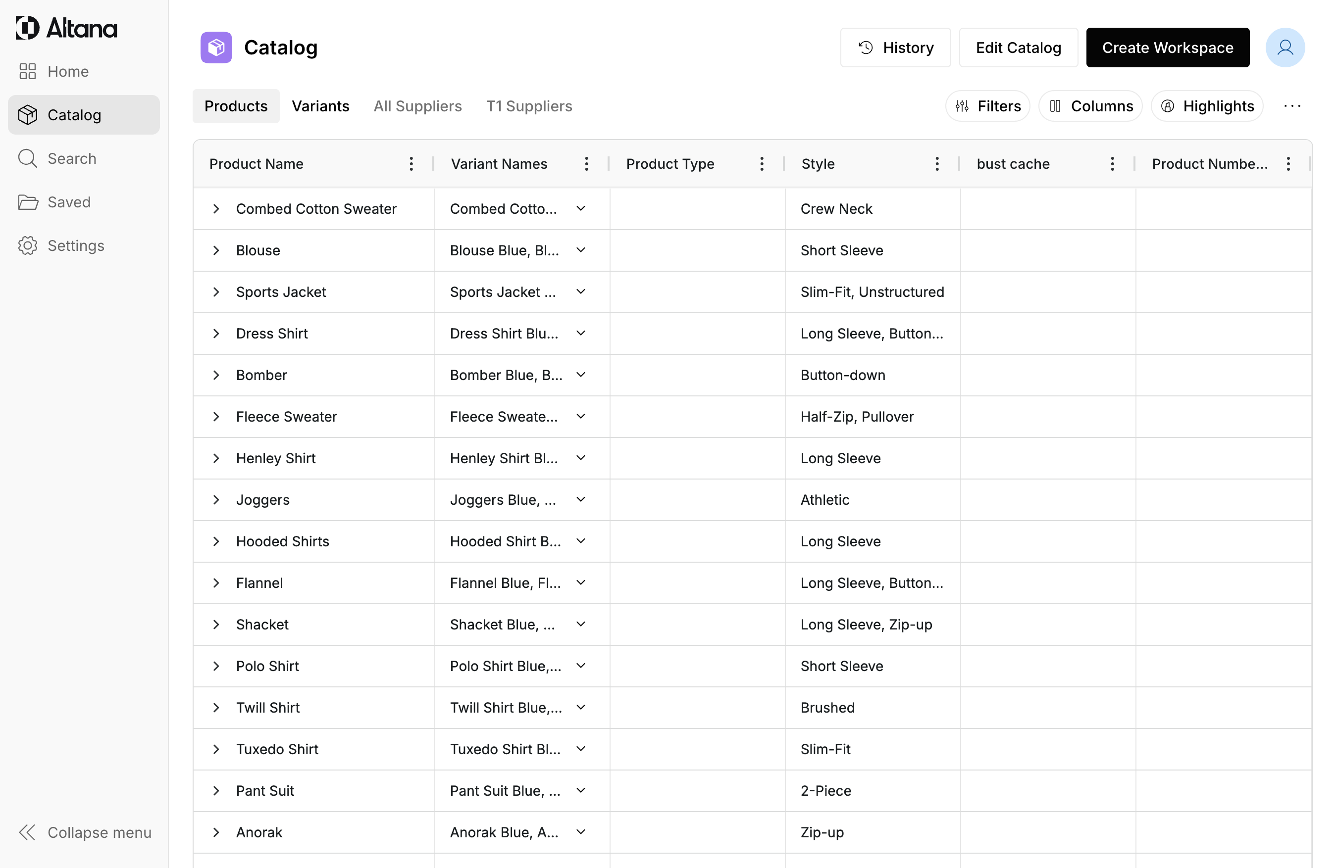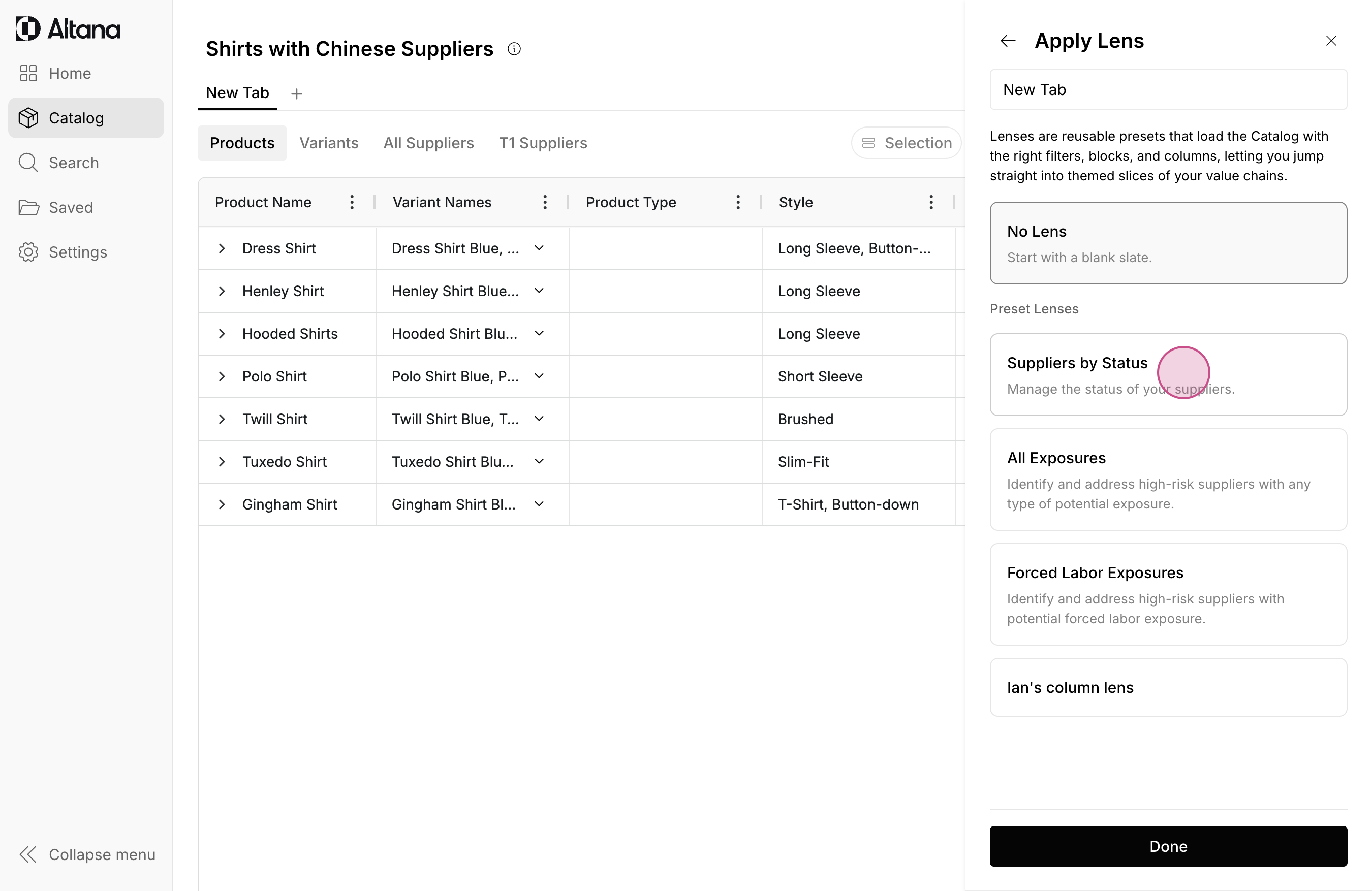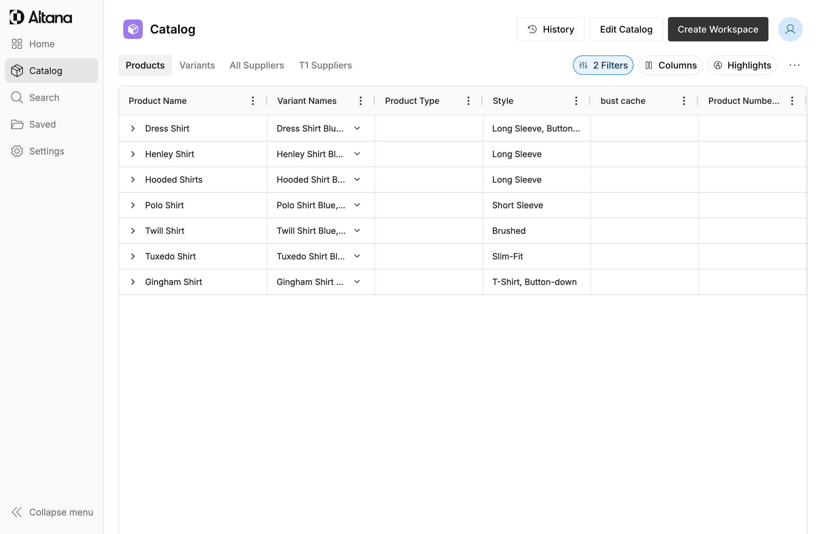 Your catalog is a repository of all the information Altana has about your products. This includes the list of products that are included in Altana, variants of those products, such as specific colors or styles, the suppliers that supply those products across all tiers of your value chains, and the T1 suppliers that supply you directly.