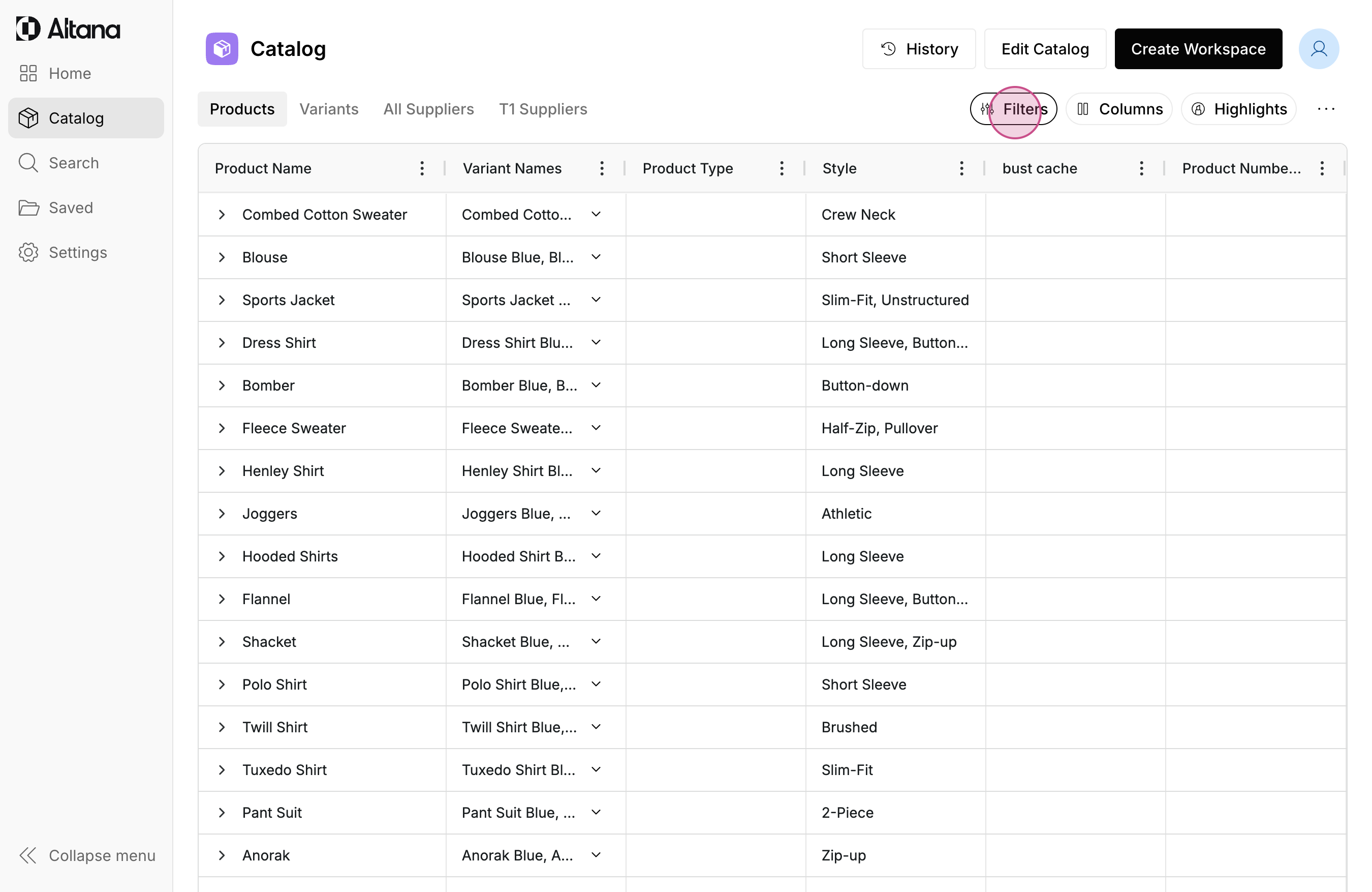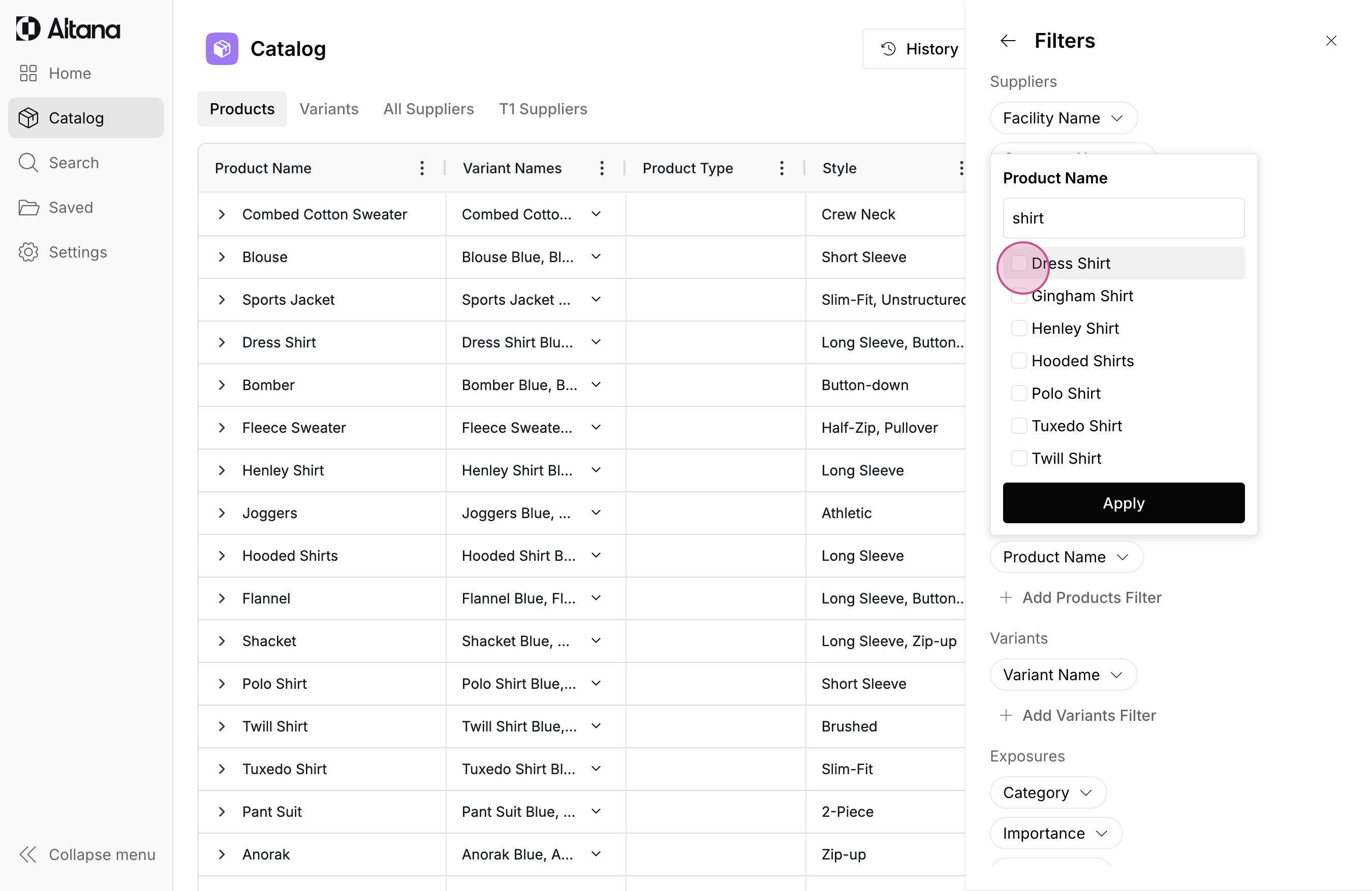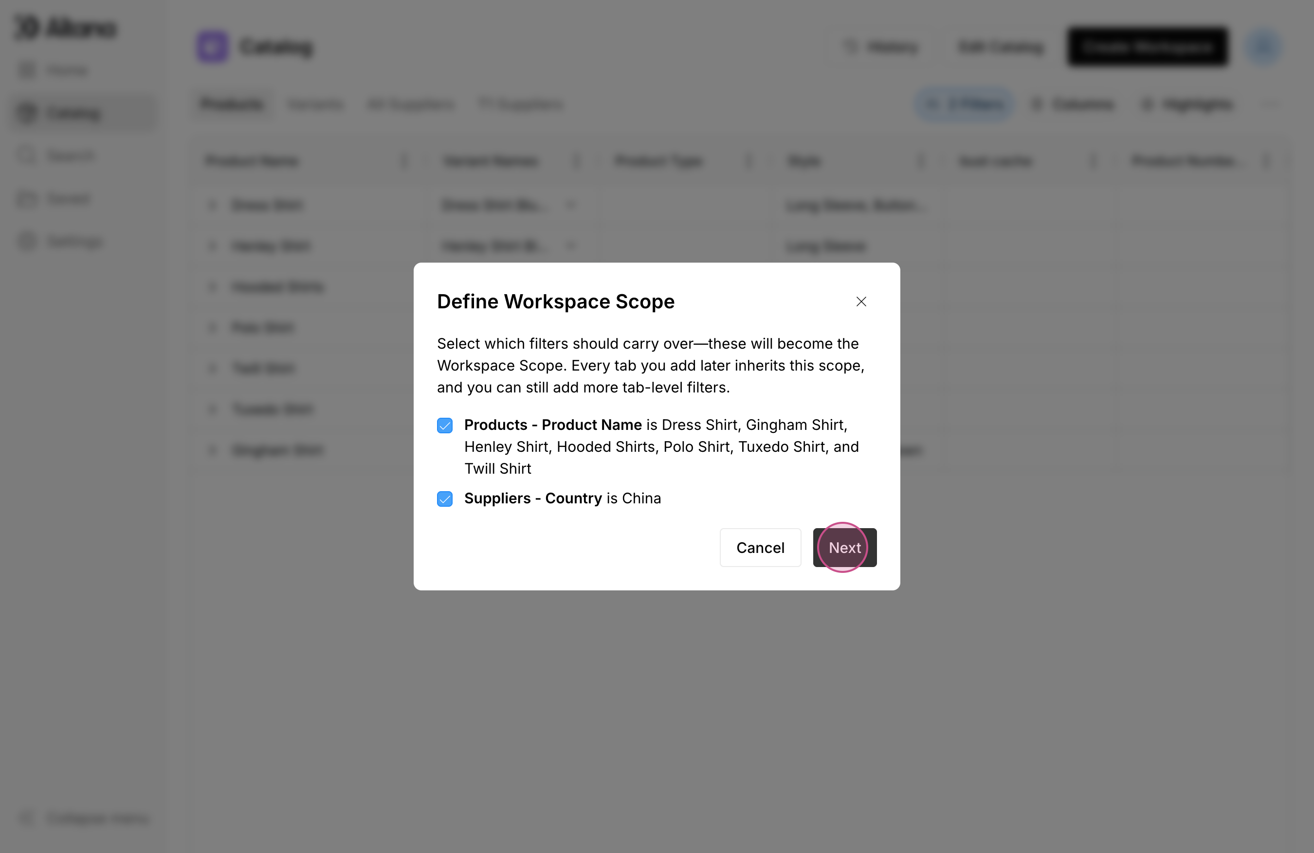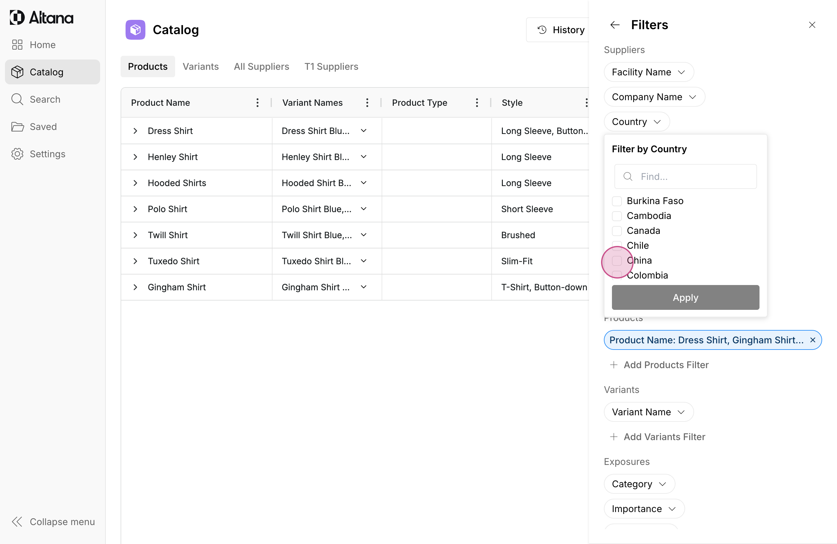 Step 3: If you want to create a workspace that only has a subset of your products in it, first apply filters to your catalog. For instance, if you want to create a workspace that only contains shirts with suppliers that are located in China, you could apply those filters to your catalog.