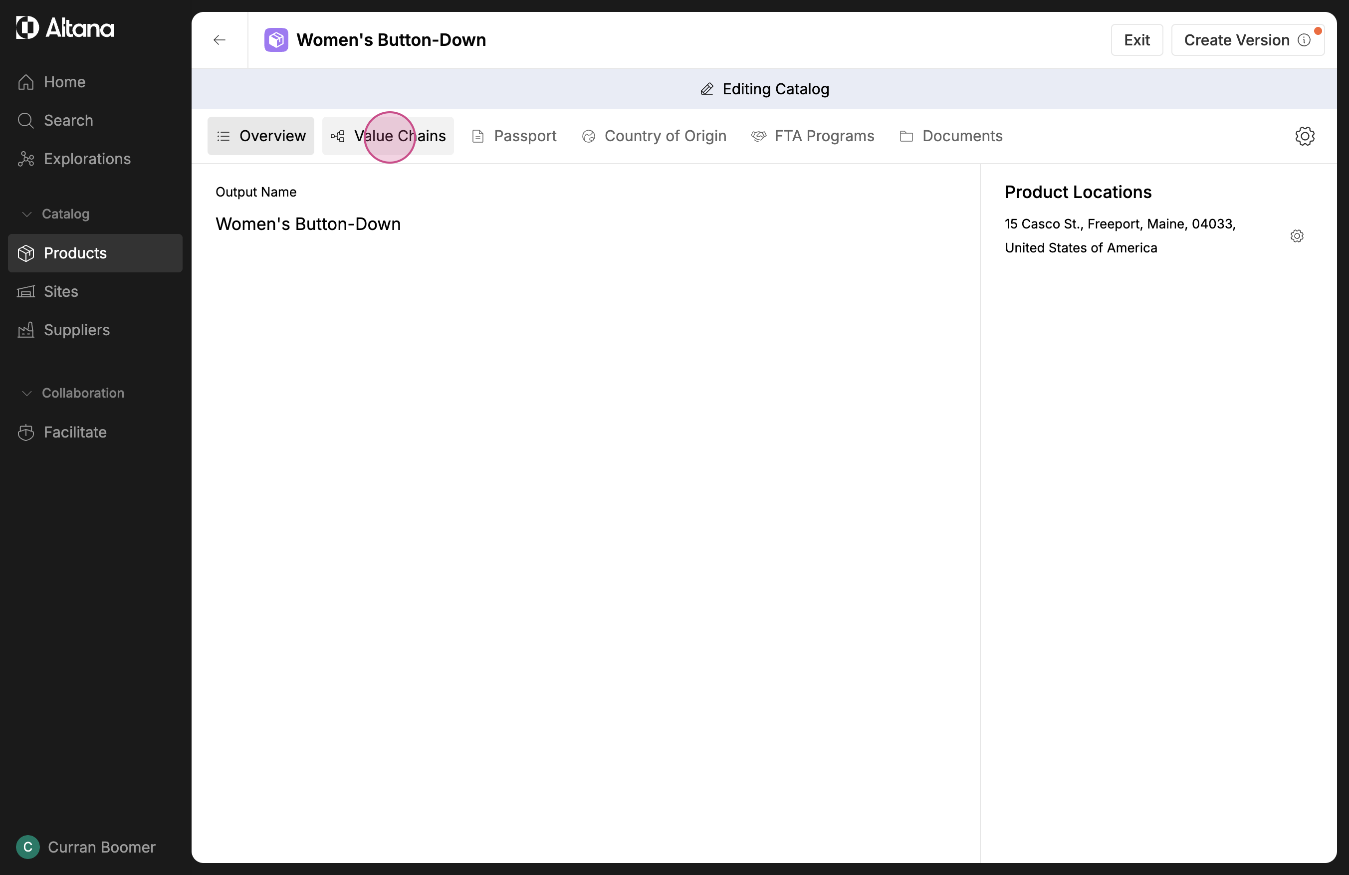 Step 1: Select your product in the catalog and then select Value Chains to see a visual representation of your product's value chain.
