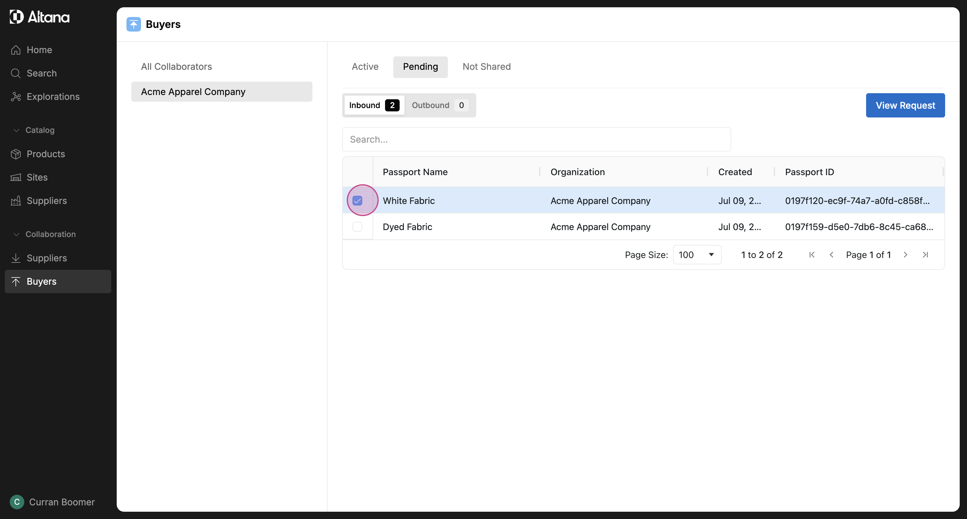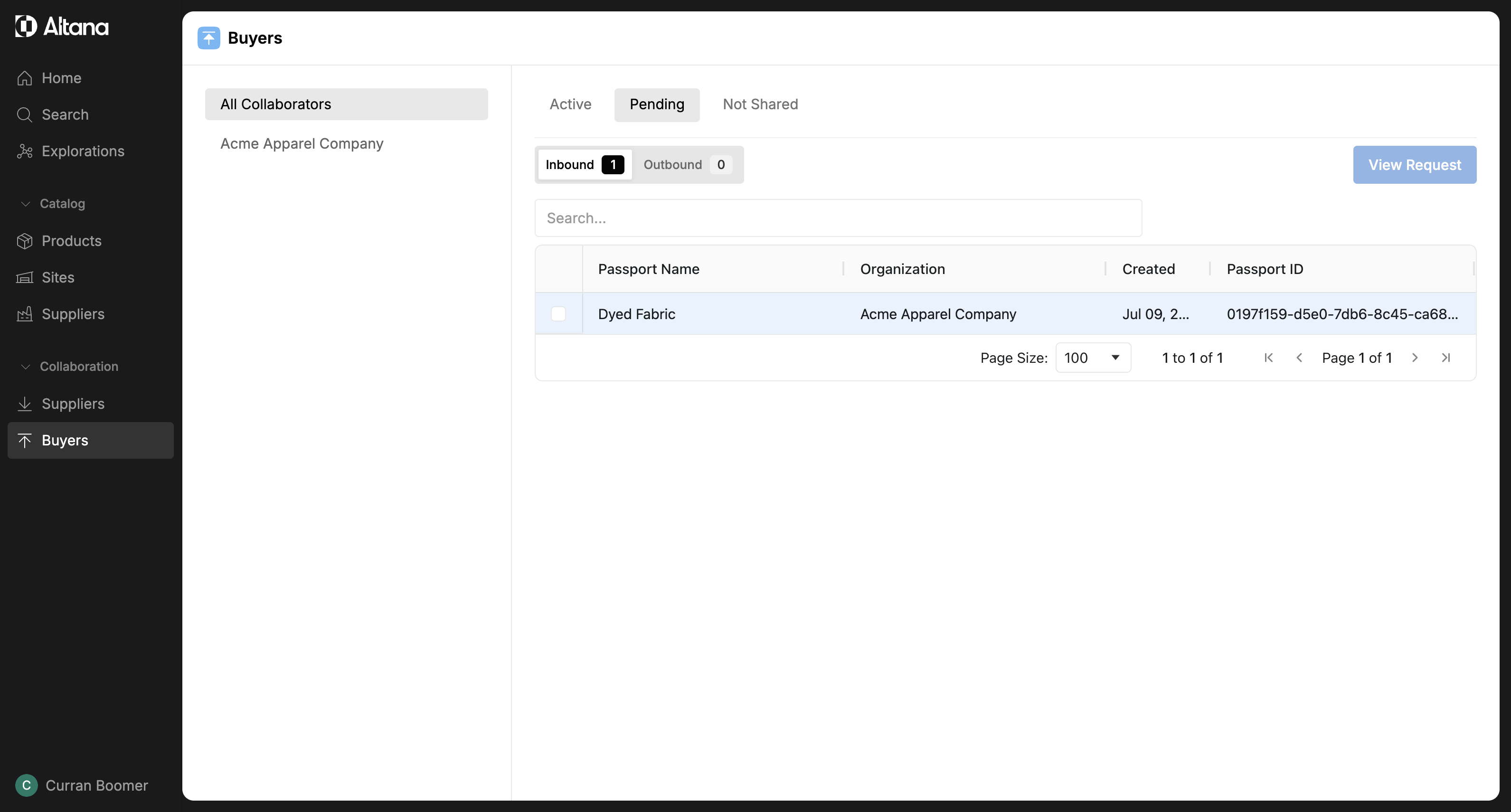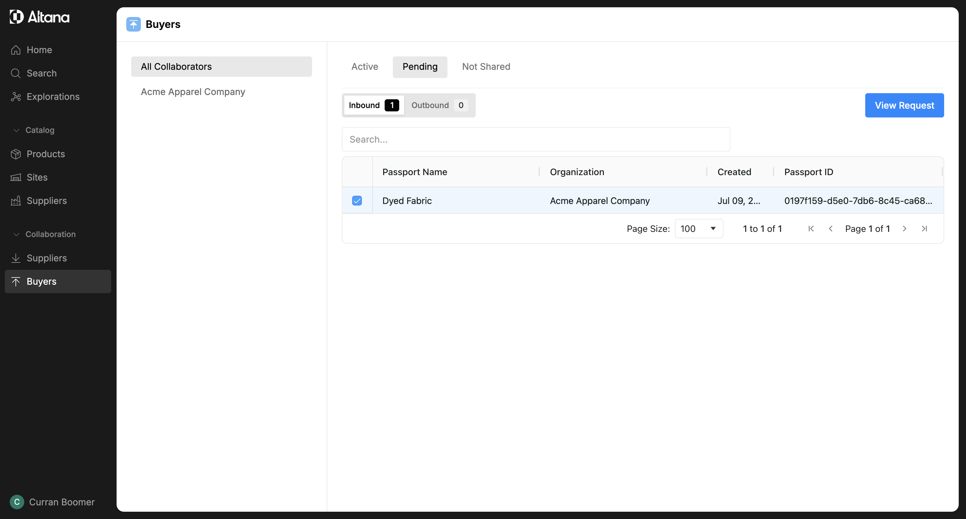 Step 3: Under the Pending tab, view the inbound requests from the selected buyer. Click on the product passport you wish to collaborate on.