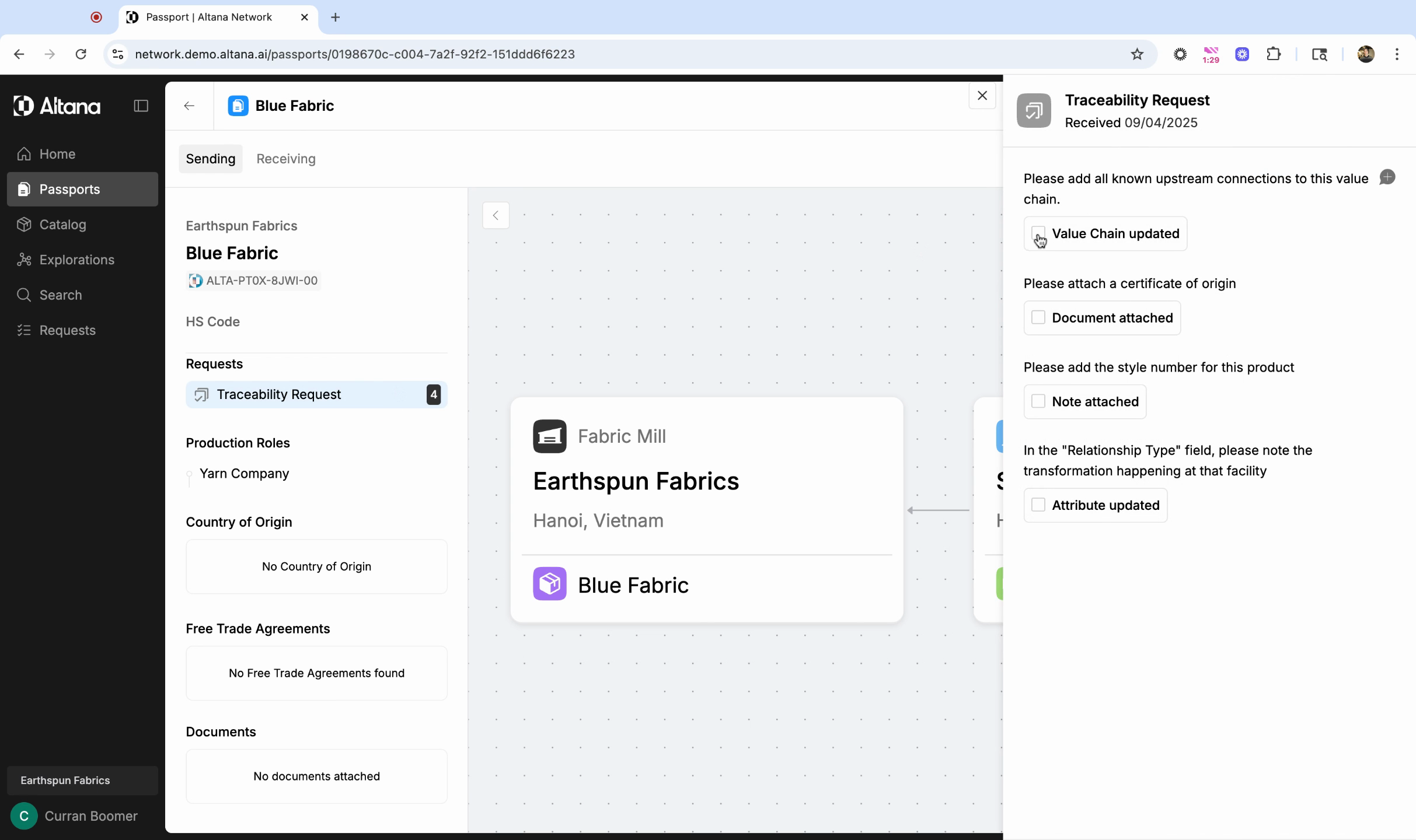 In this tutorial, we're using a product passport for blue fabric that we've already shared with our buyer.