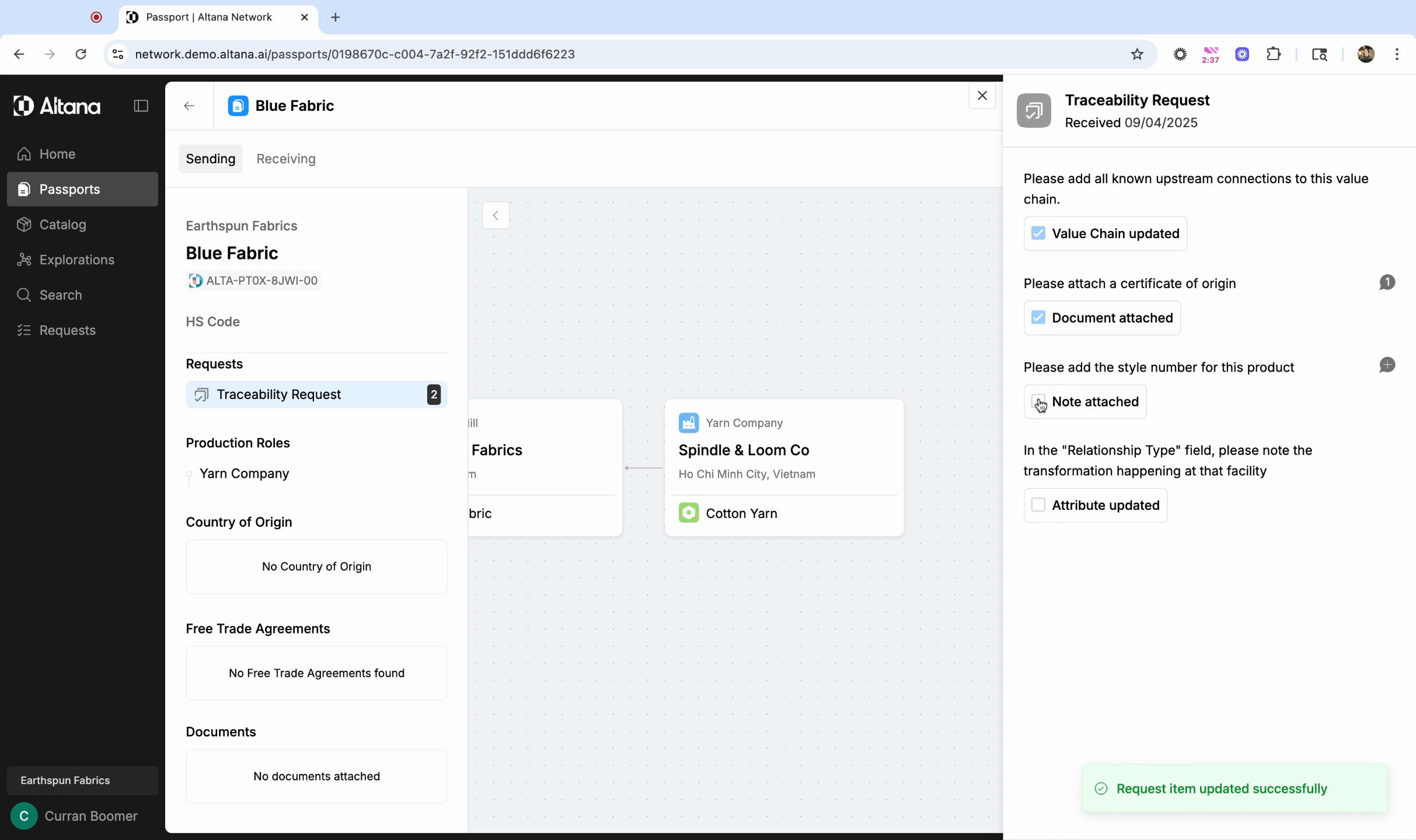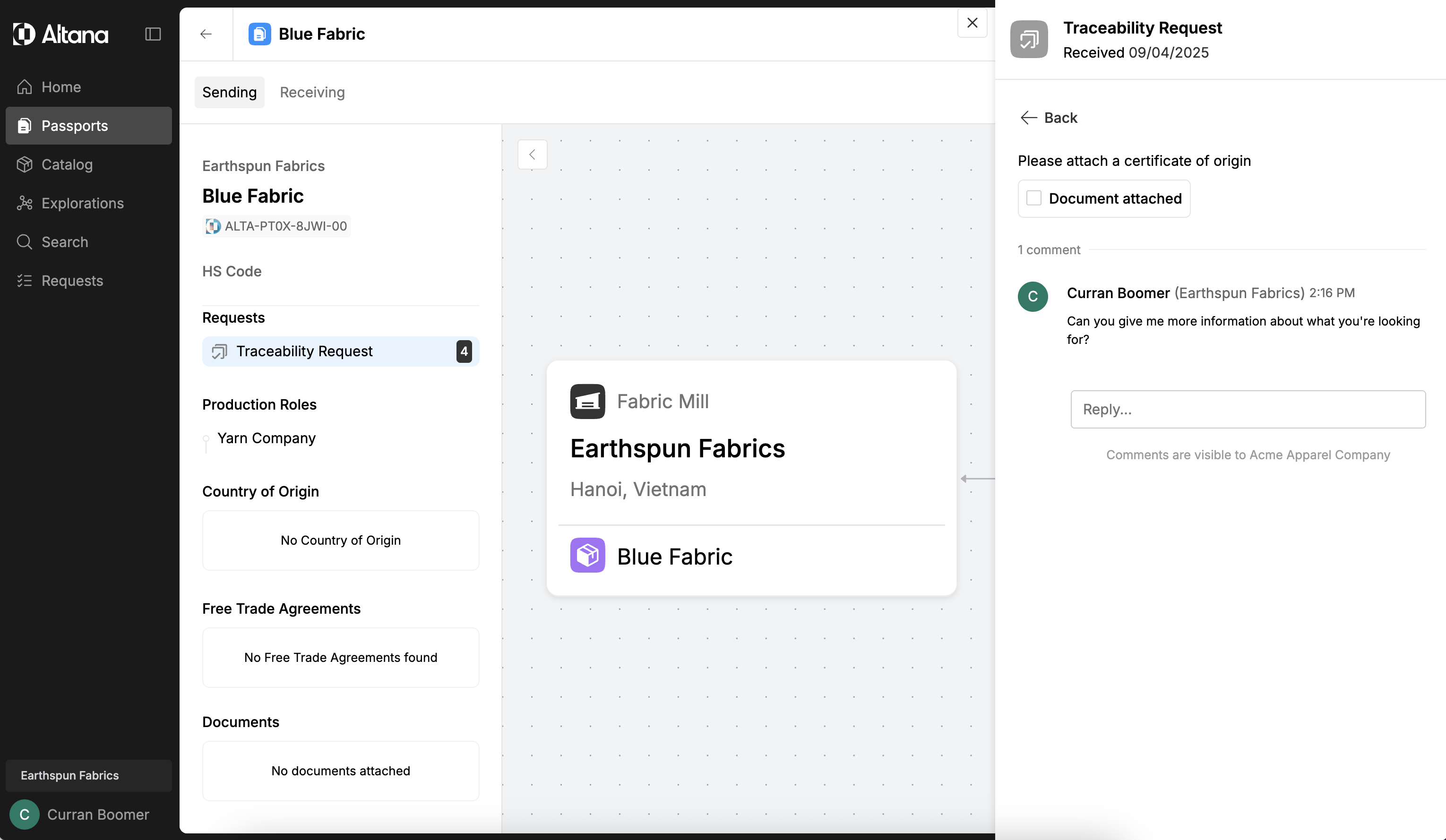 Step 6: Complete these request items within the Product Passport. For instance, after adding all upstream connections for this product passport, check this off the list. If you have any questions about an item, select the comment bubble and write a comment.
