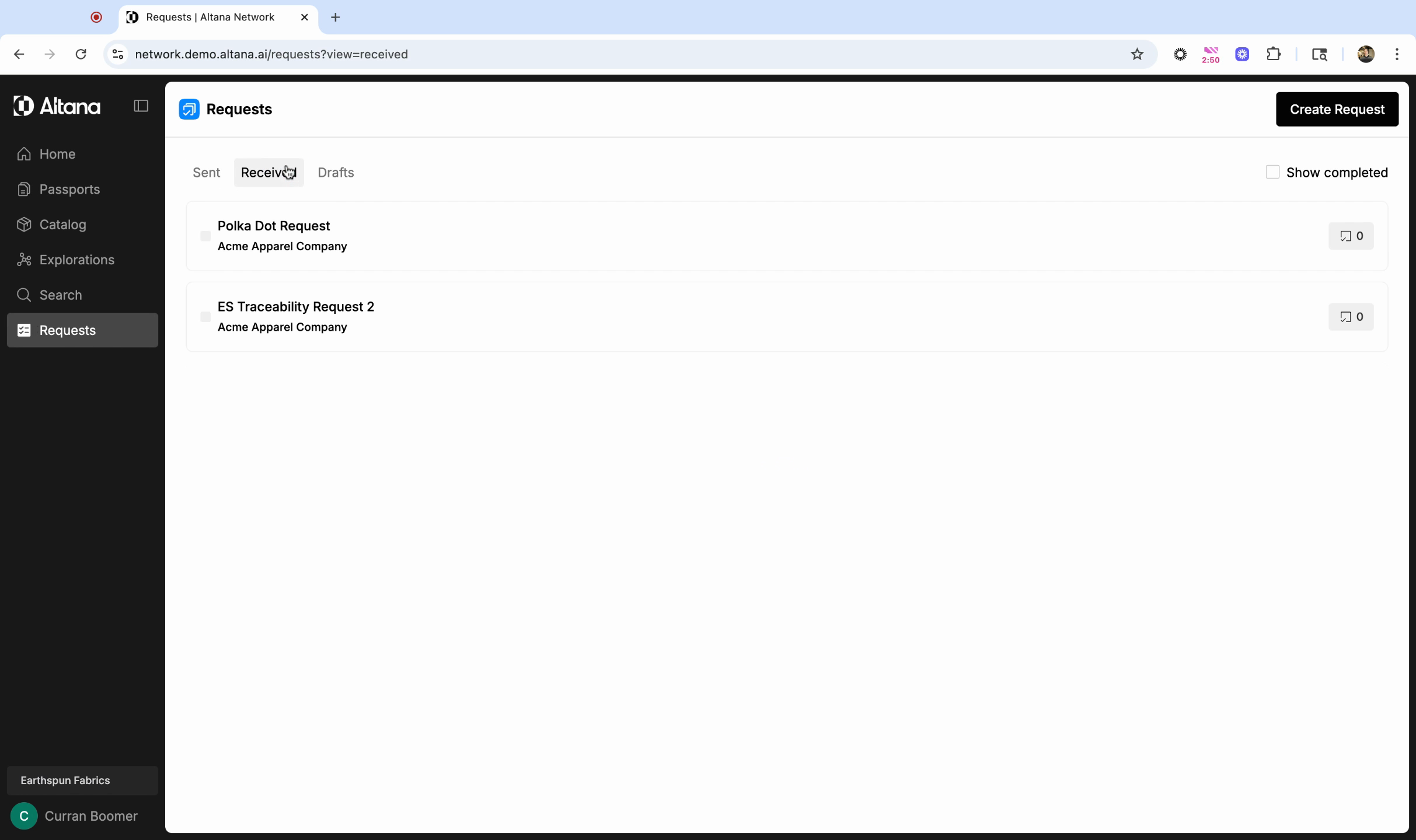 Step 8: Keep track of incoming requests by navigating to Requests on the left-hand menu, then to Received. Here, you'll see all requests you've received from your buyers. You also have the option to create and send your own requests to your suppliers.