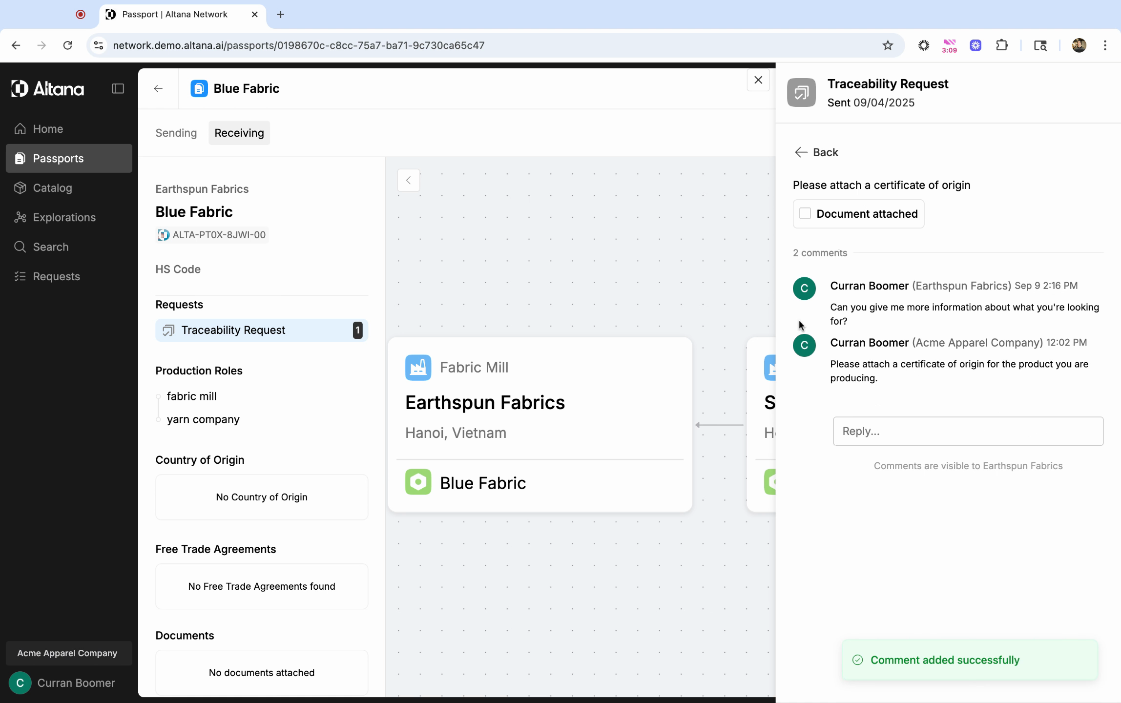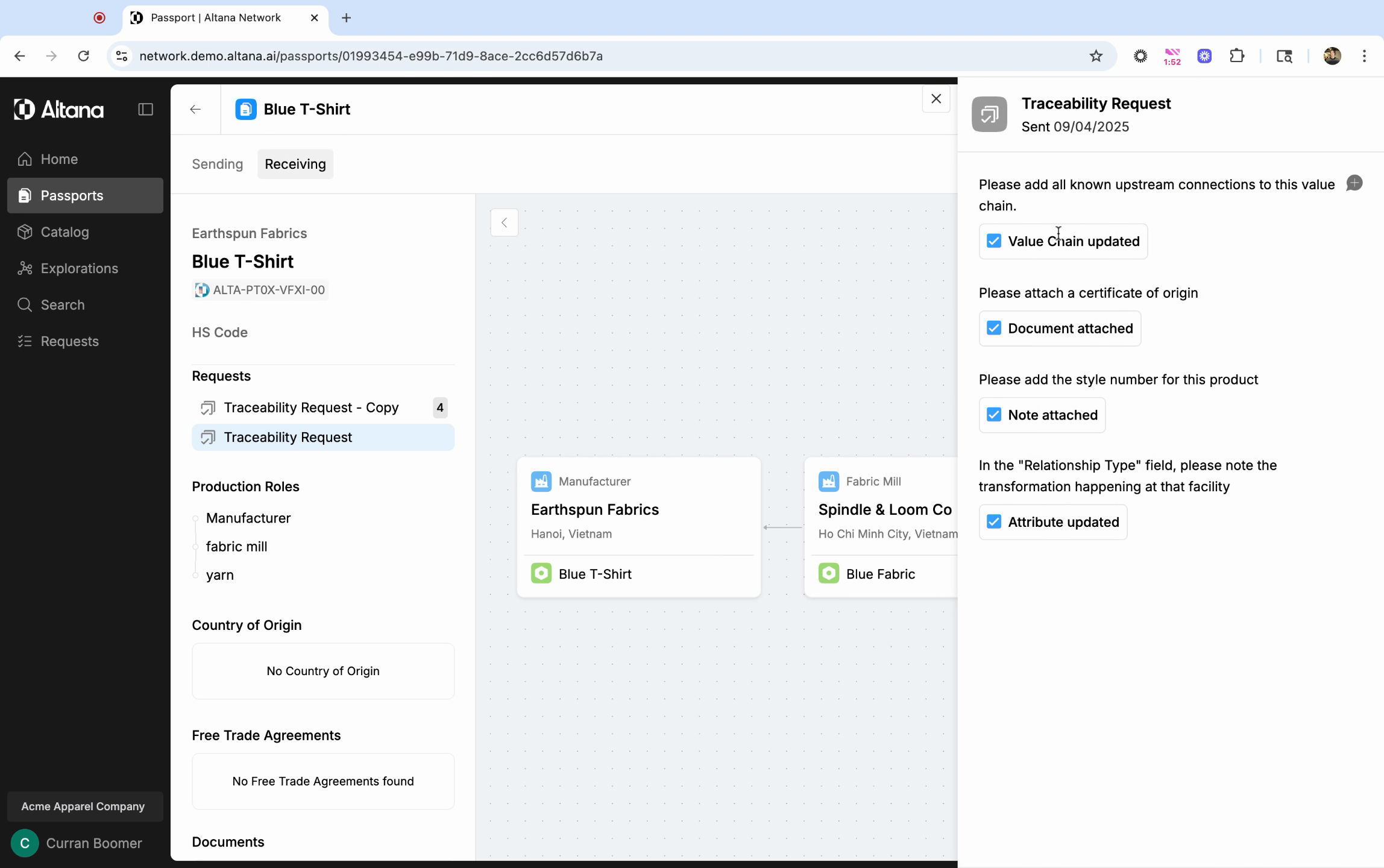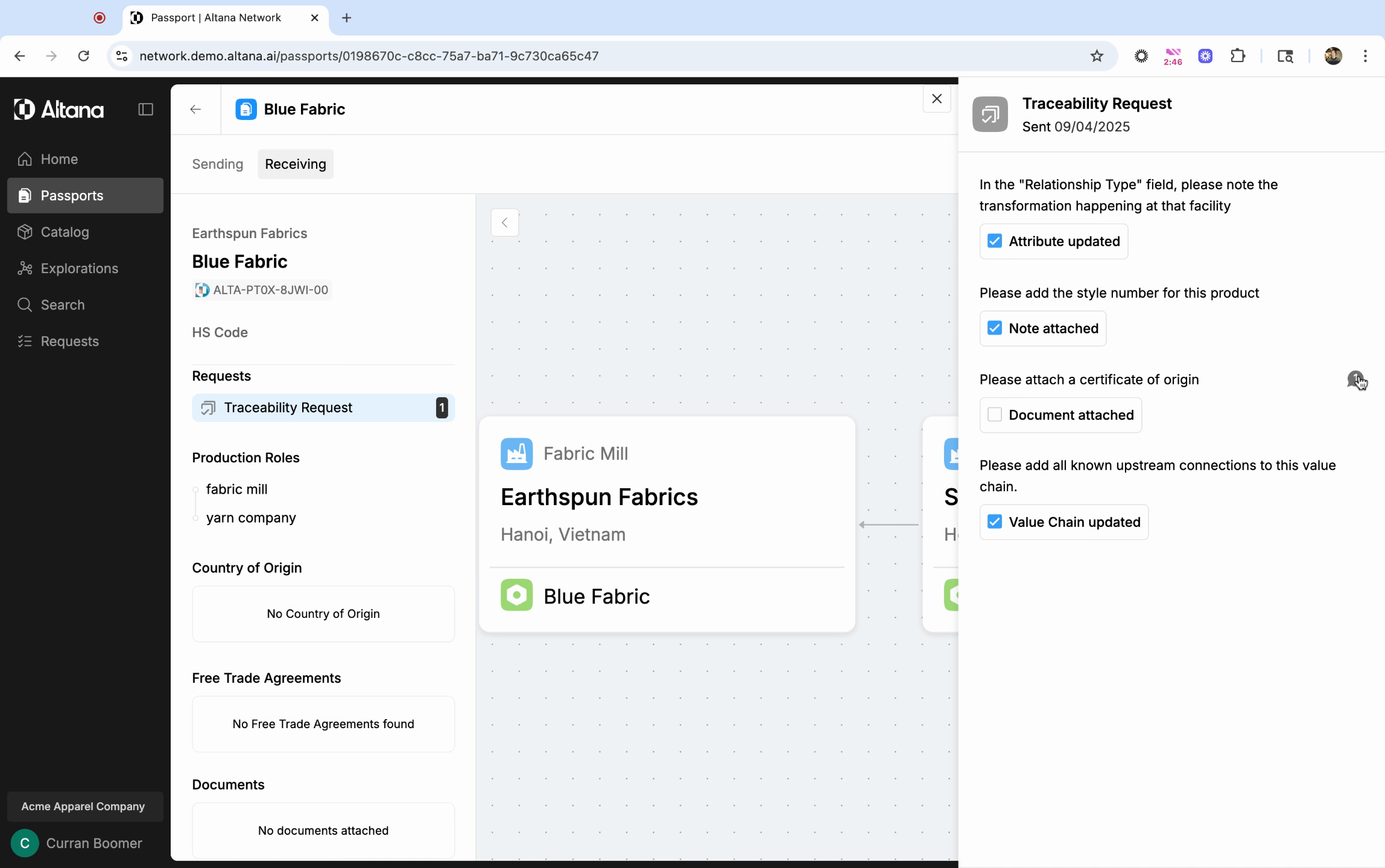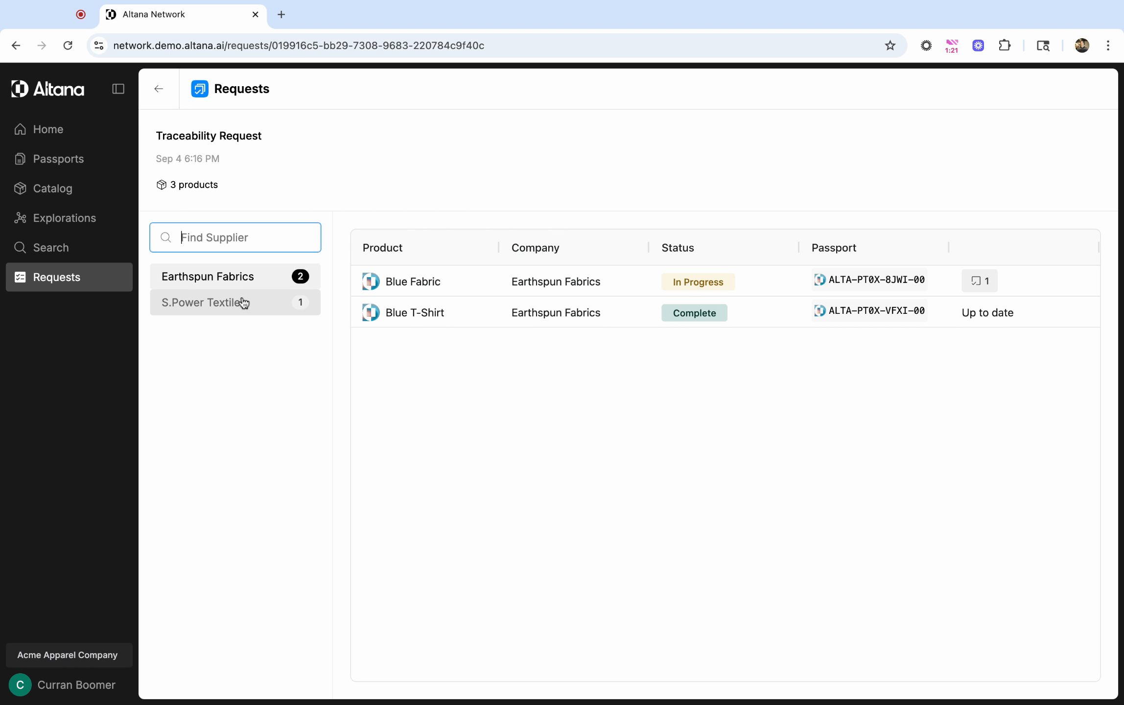 Here, you'll see the suppliers who received this request and the Passports for the products you've asked about in your request. Each passport also has a completion status, letting you know if this request has been completed.