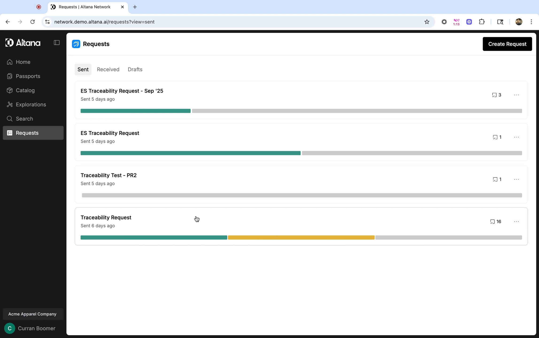 The progress bars indicate the completion status of each request. Since traceability requests are managed through Product Passports, progress is tracked on a per-Passport basis.