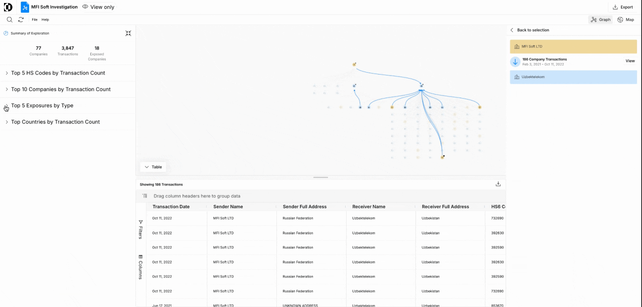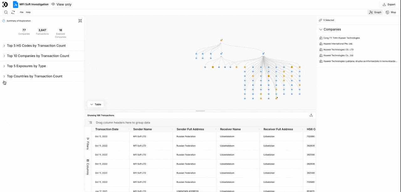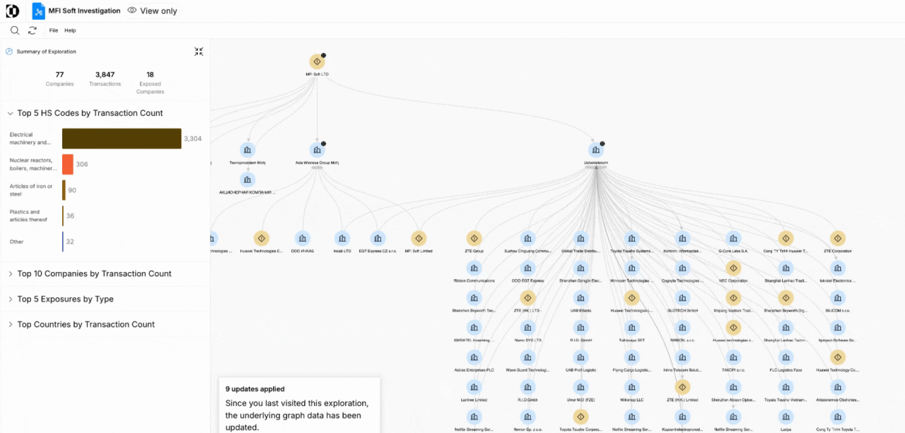Step 4: Click into the results to see them highlighted in the network. For example, click into the 3,304 Electrical Machinery and Equipment HS Codes to see them highlighted in blue. Then, click on each of these transactions on the right to learn more.