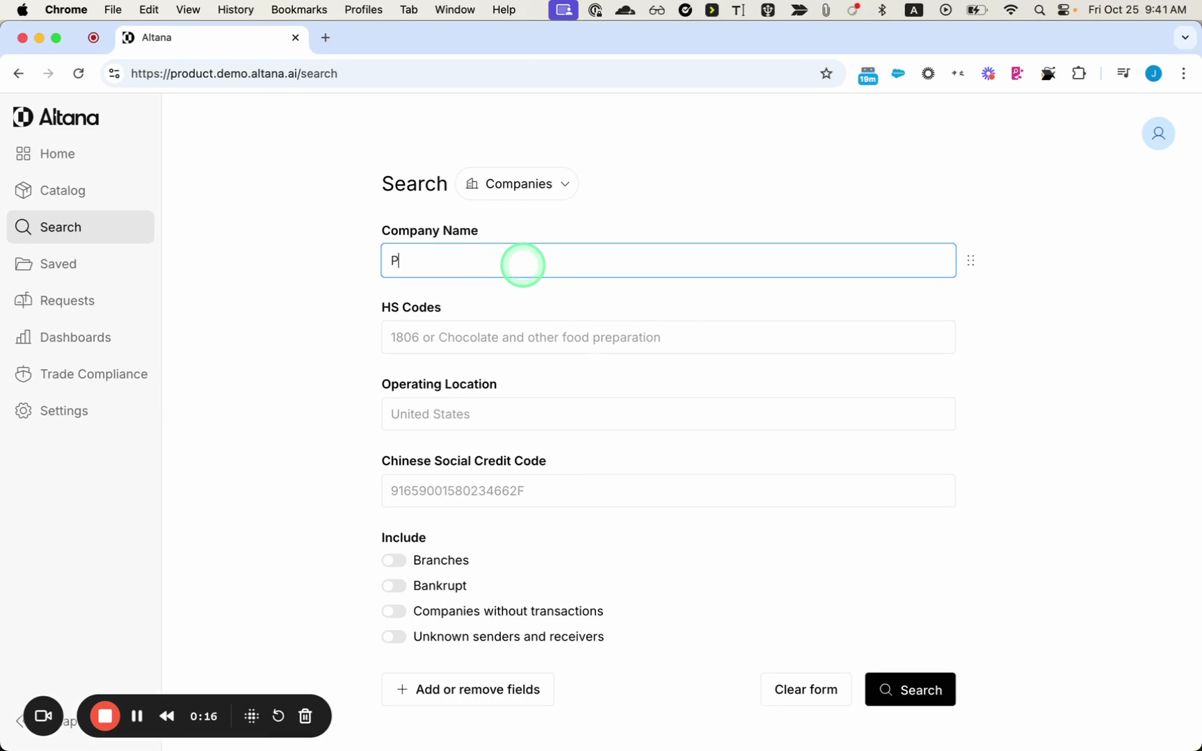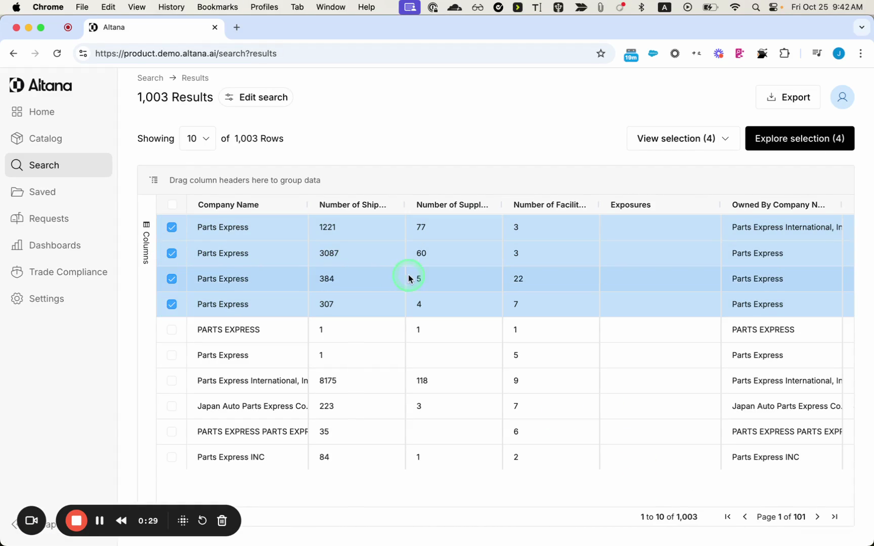 This demonstration, I'm going to show how to search for multiple companies at once and apply filters across every company in the search exploration canvas. Then I'm going to save this as a file and share it with a colleague. So I'm gonna input a company name that I'd like to search for in this case. I'm looking for Parts Express