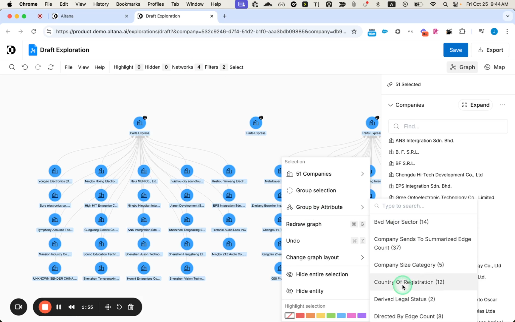 I'm able to group the entire selection, and I would like to group by country of registration. And so here are all the companies that are sending to my search targets.