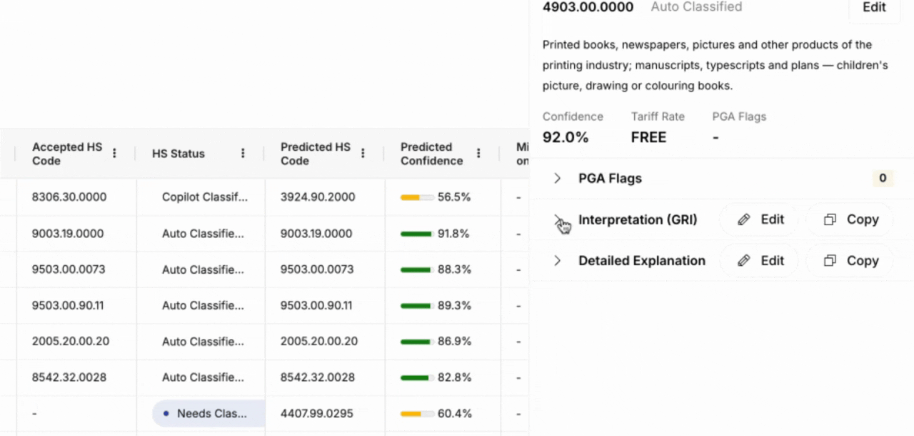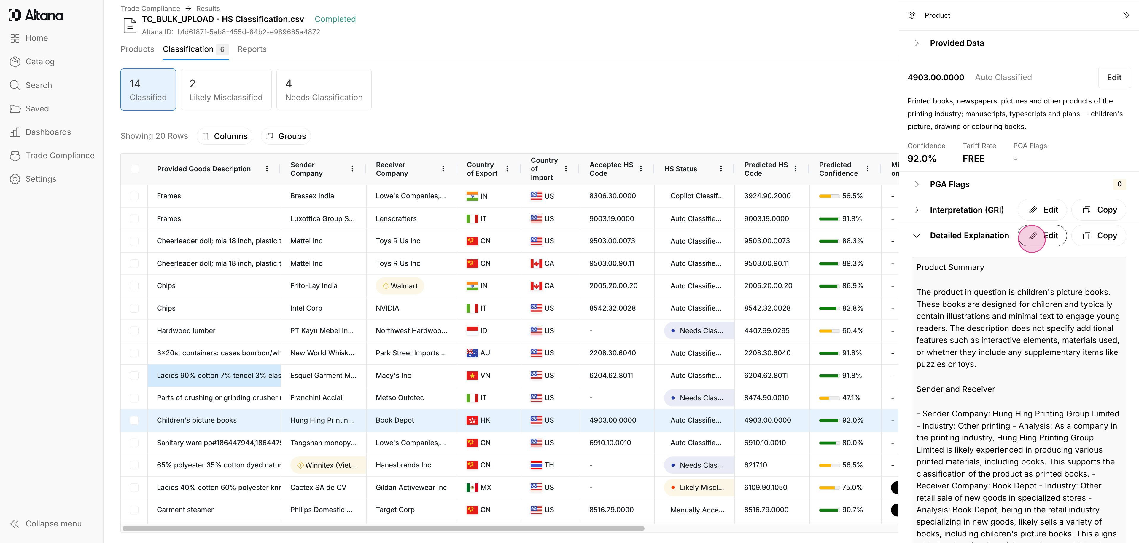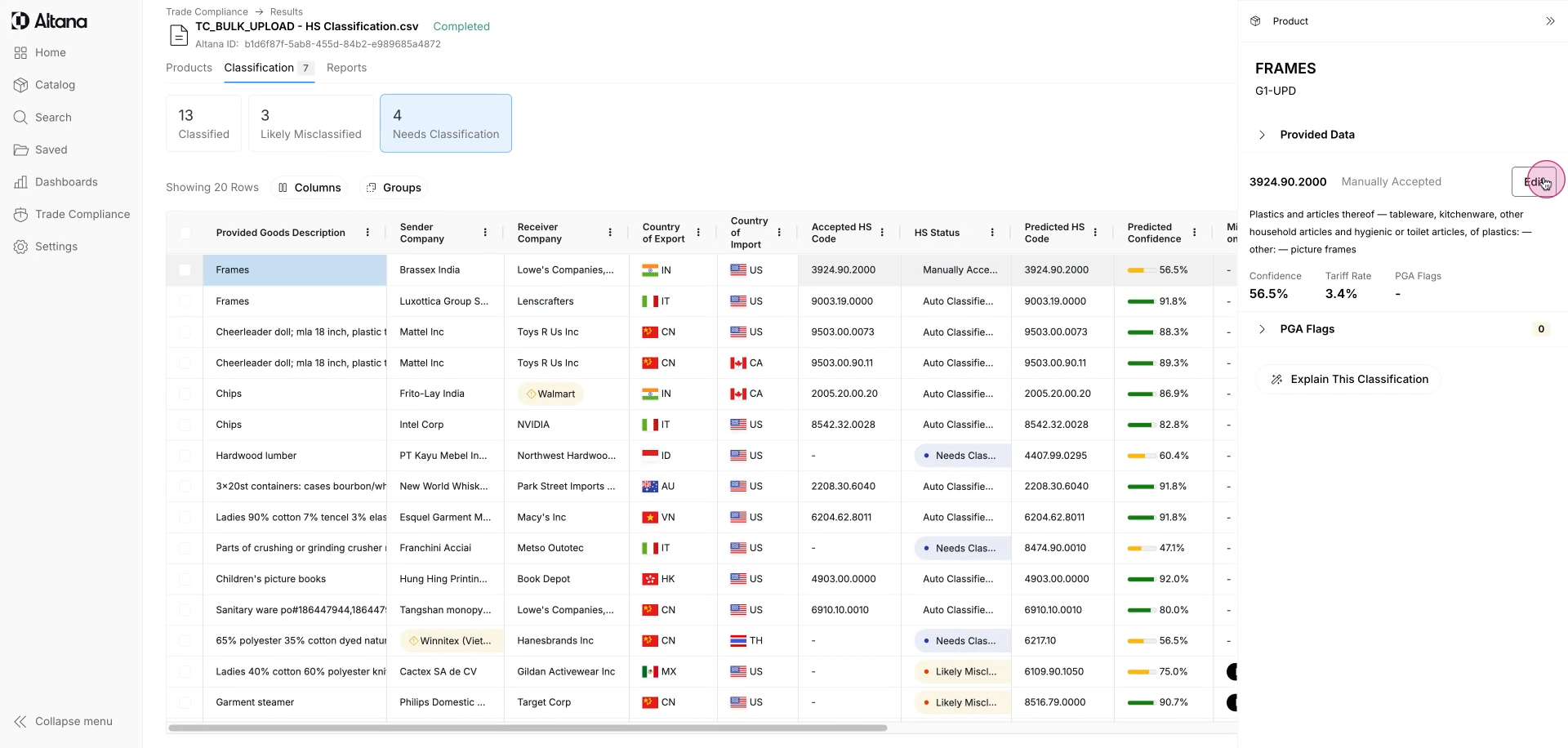 Step 7: It is crucial to note that products with a Classified status can be amended by clicking Edit. This will allow a user to select from Altana's top five predicted classifications, engage with our AI-backed chatbot, Co-pilot, or manually classify the good - more on that during the Needs Classification section.