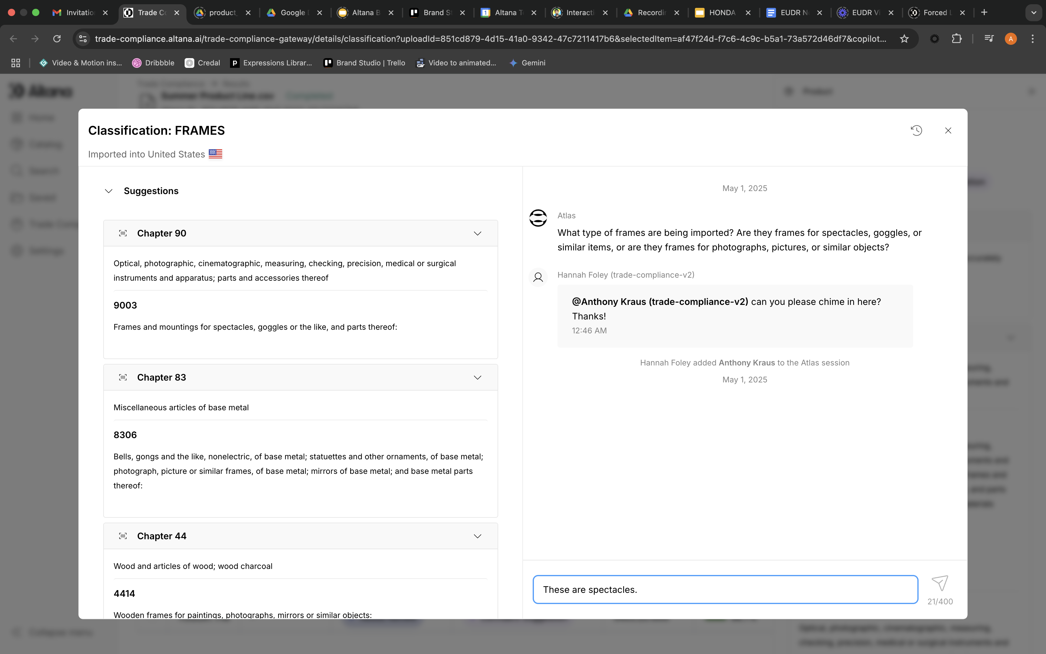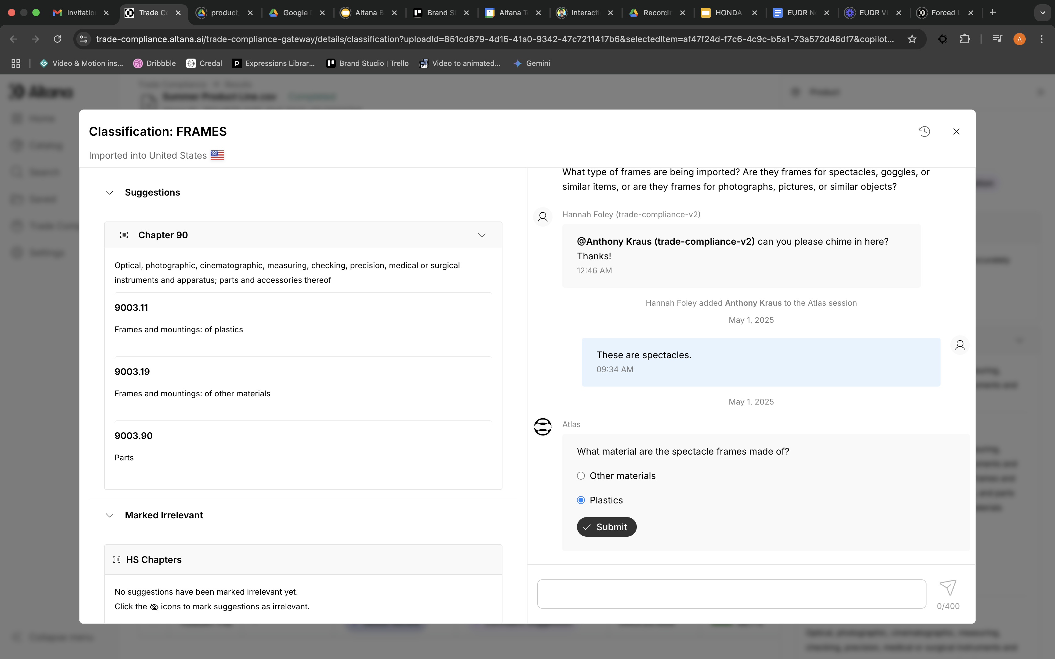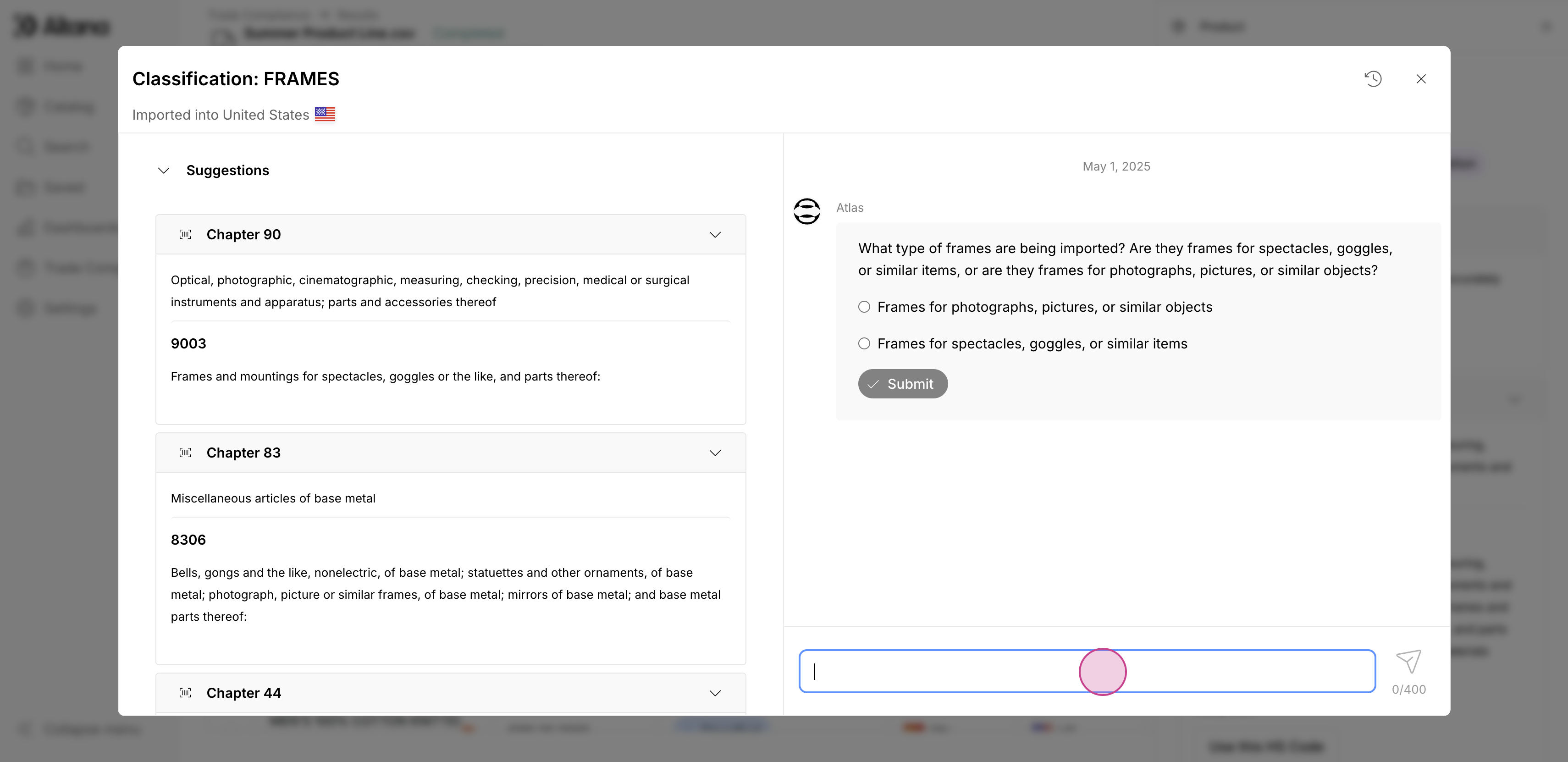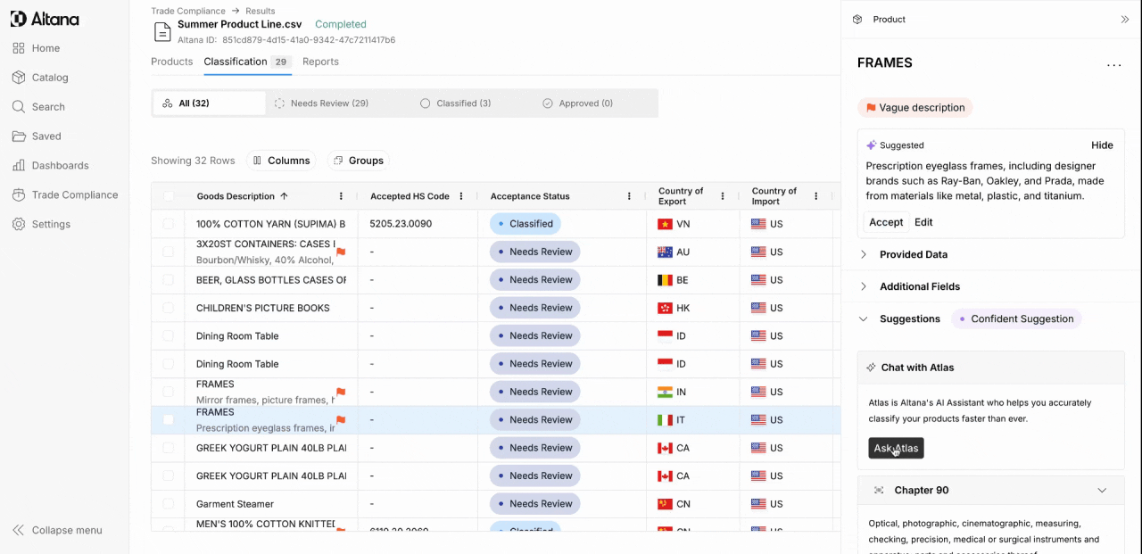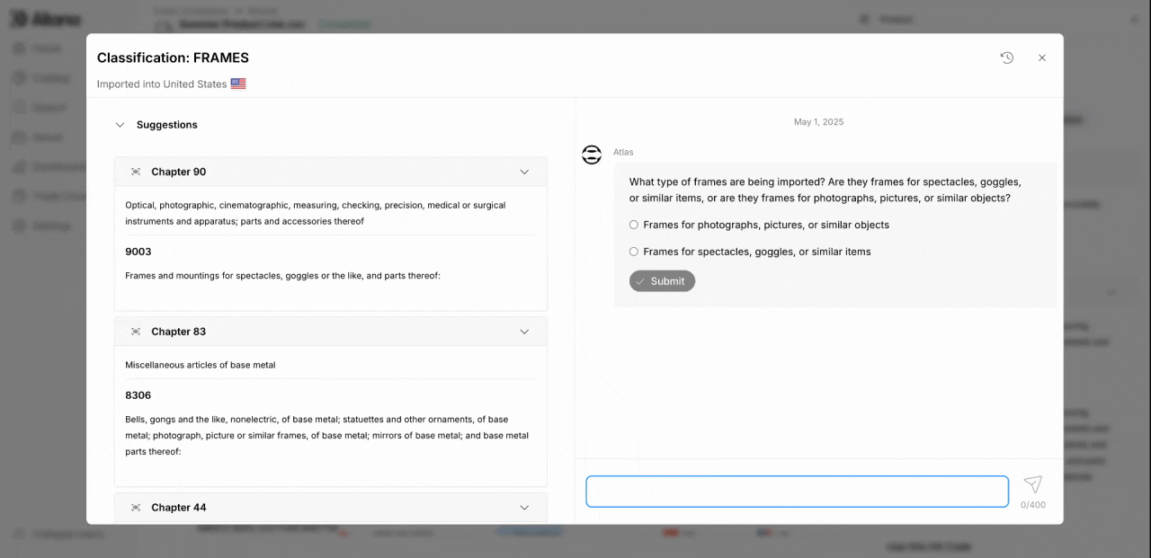 Stuck on a complex classification? Chat with Atlas and seamlessly loop in your customers when you need their expertise. Our secure permissions system eliminates disjointed email threads by bringing everyone into one conversation, creating a frictionless workflow that leads to faster, better classification decisions.