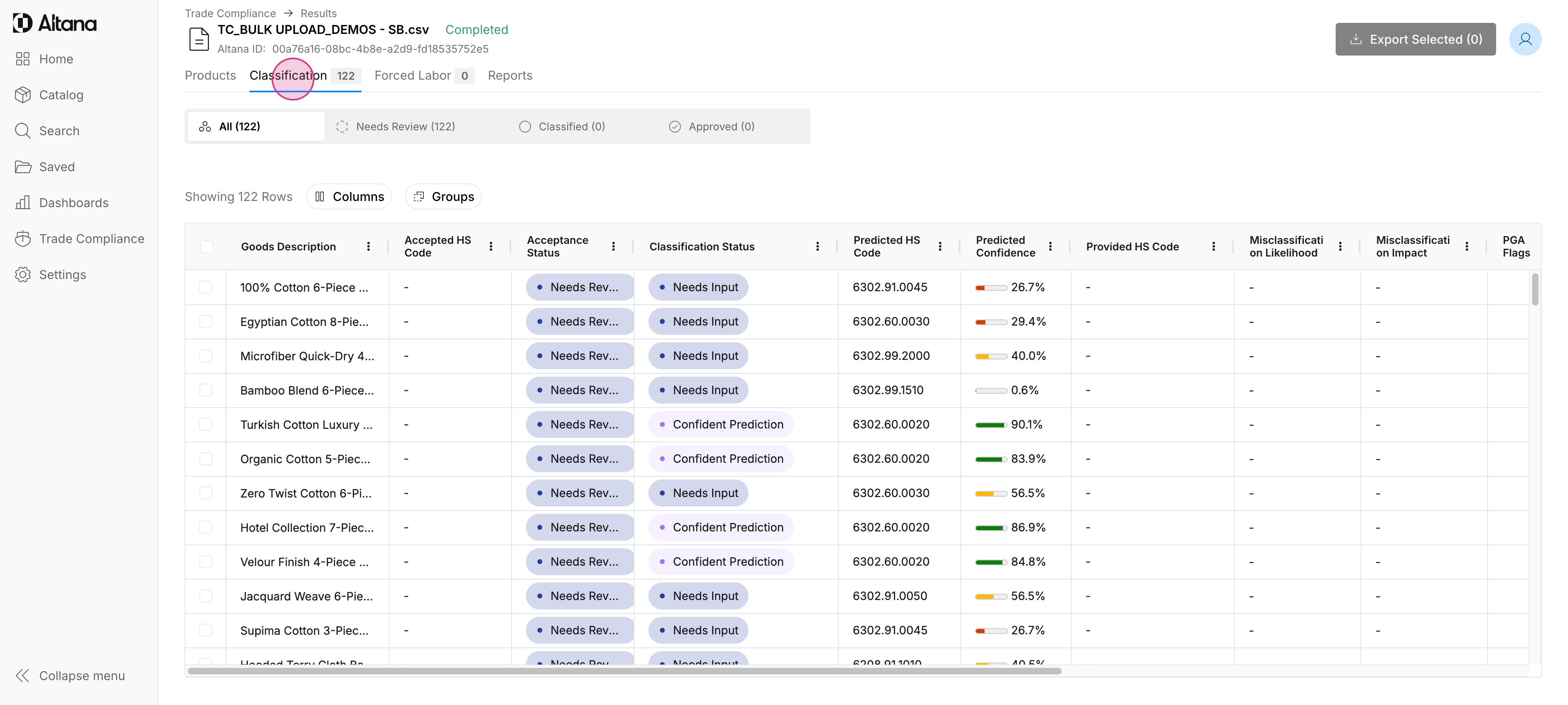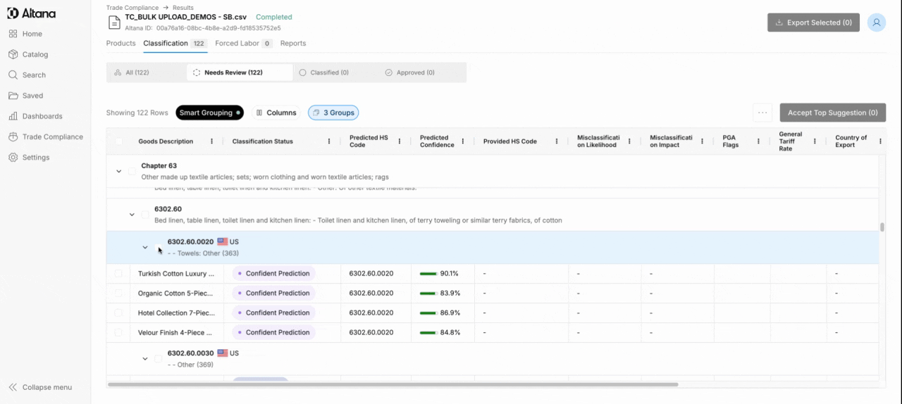 Step 2: Once you're in the Needs Review tab, you'll find that your products have been automatically sorted with Altana's Smart Grouping feature. Your products are arranged according to our top predicted HS chapter, subheading, and HS10 for easy review.