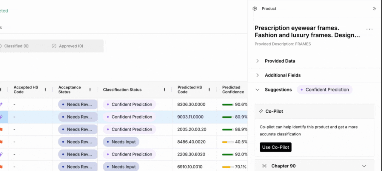 Navigate to the Classification tab and immediately see which products we have marked with an orange flag, indicating that they have vague goods descriptions. Directly underneath, you'll find Altana's suggested goods description for the product, which has been automatically enriched with online research.