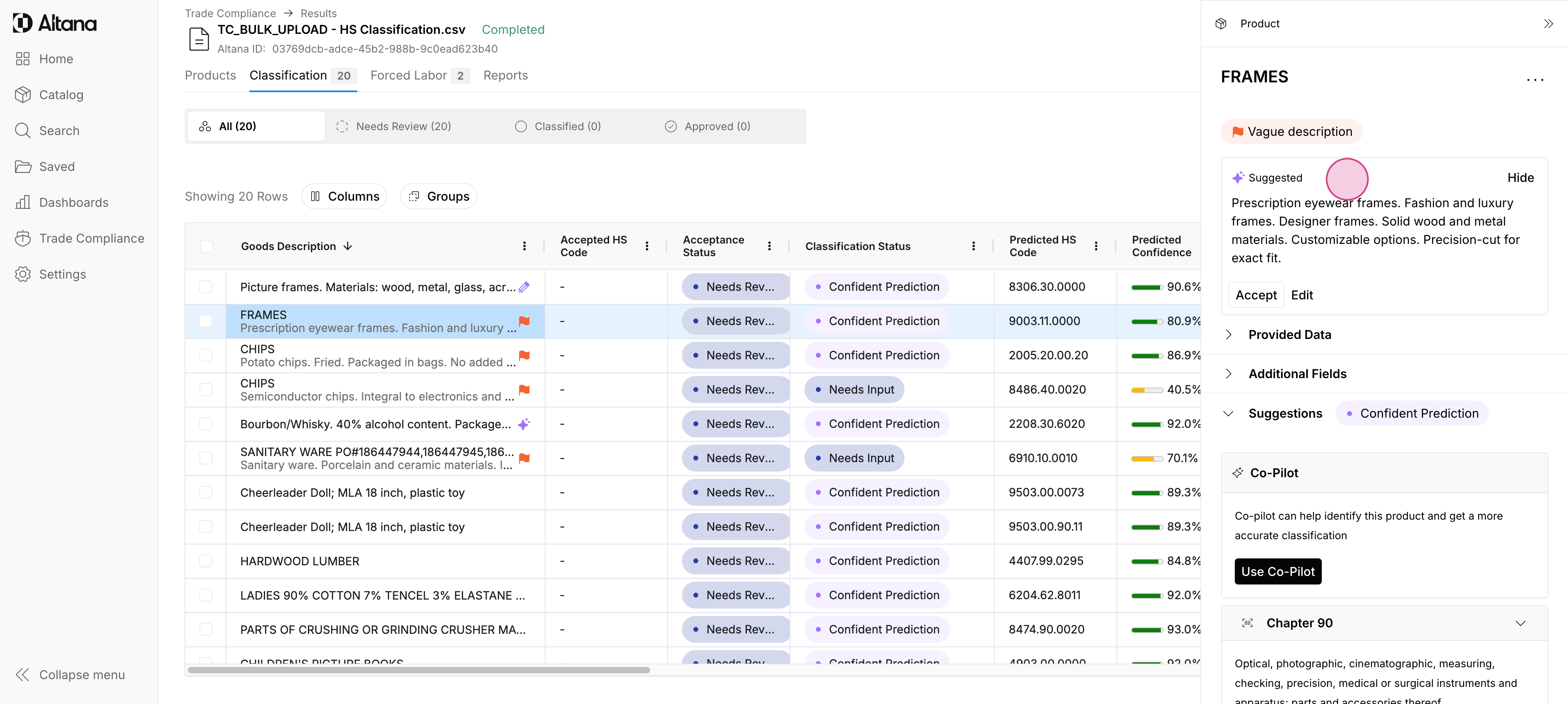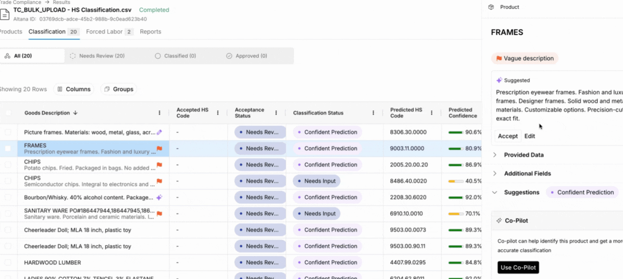 Step 3: Click on each flagged description to accept Altana's suggestions or to provide edits of your own.
