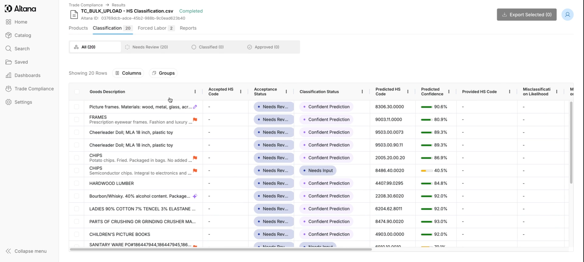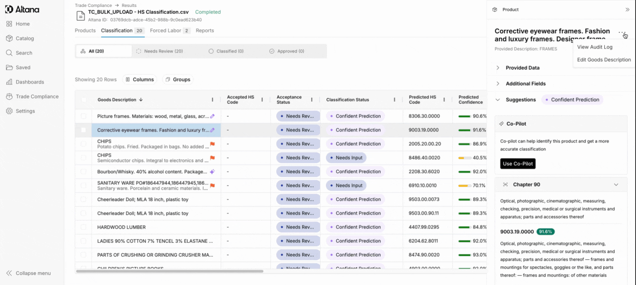 Altana automatically identifies vague goods descriptions, utilizes AI for online research to improve them, and provides clear explanations — all while keeping approval of the enhanced descriptions and their corresponding classifications in your hands.