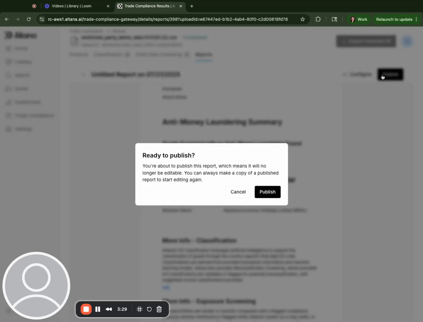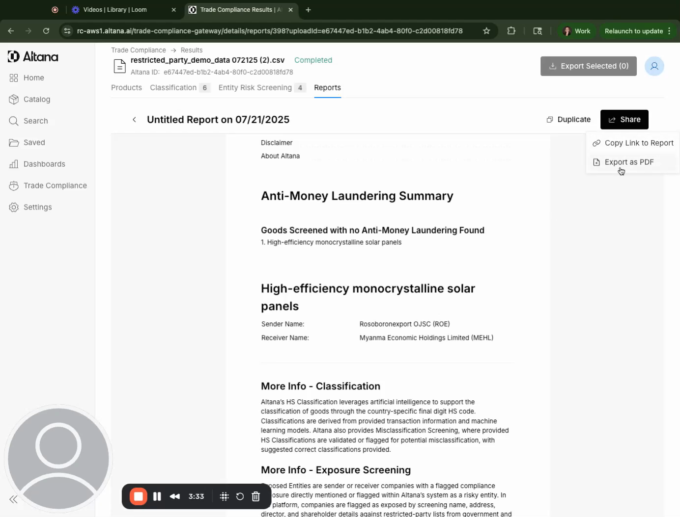 PDF Export: Admin users can also generate PDF reports, which can be configured by a feature flag. Initially, these may be separate reports for Forced Labor, Denied Party Screening, and Anti-Money Laundering, but the goal is to combine them into one comprehensive report.