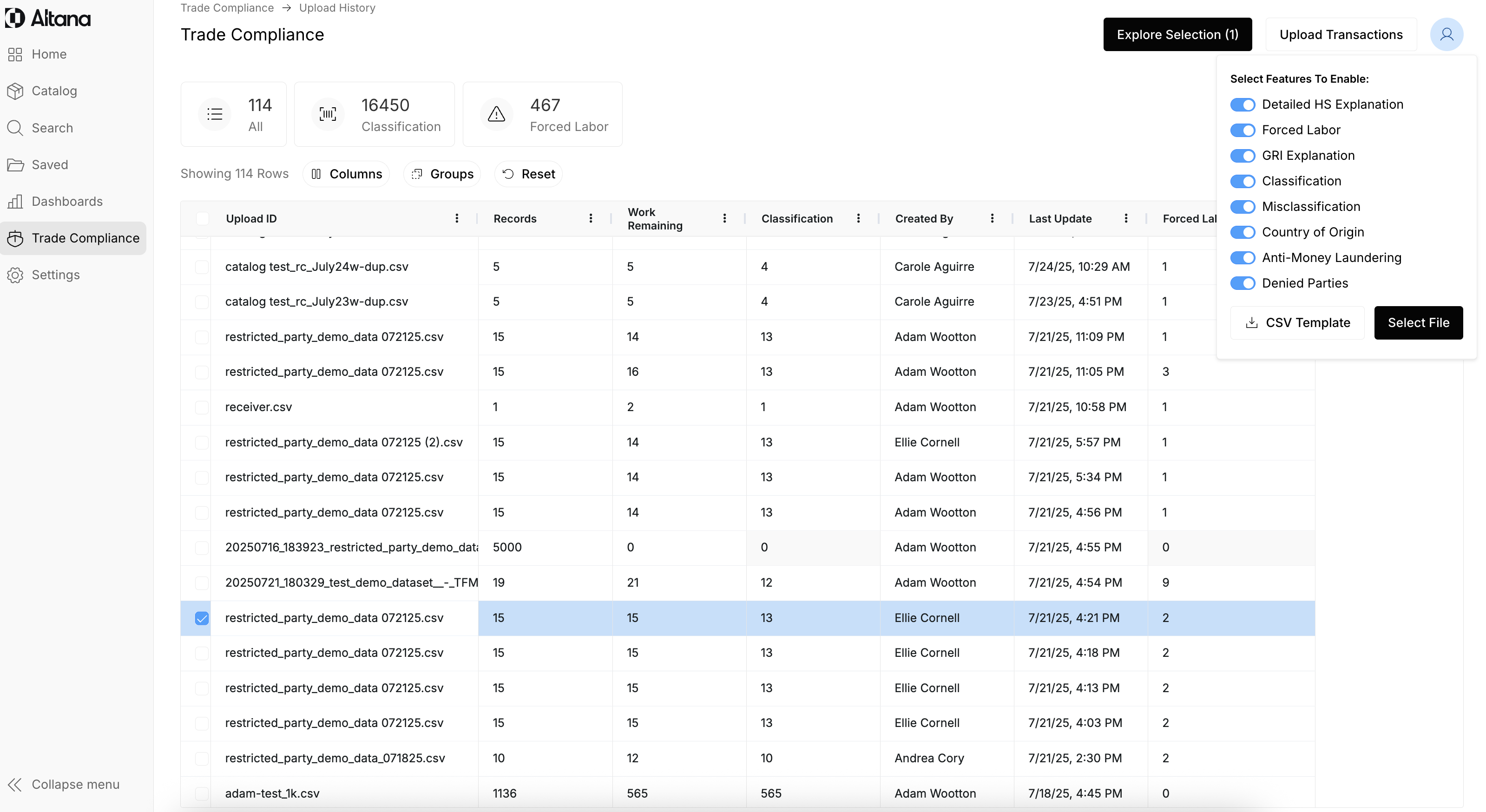 Step 2: Navigate to the entity risk screening tab. After you upload your transaction, click Explore Selection. Then, navigate to the Entity Risk Screening filter. Then, you are able to see all of your exposures across Forced Labor, Anti-Money Laundering, and Denied Parties.