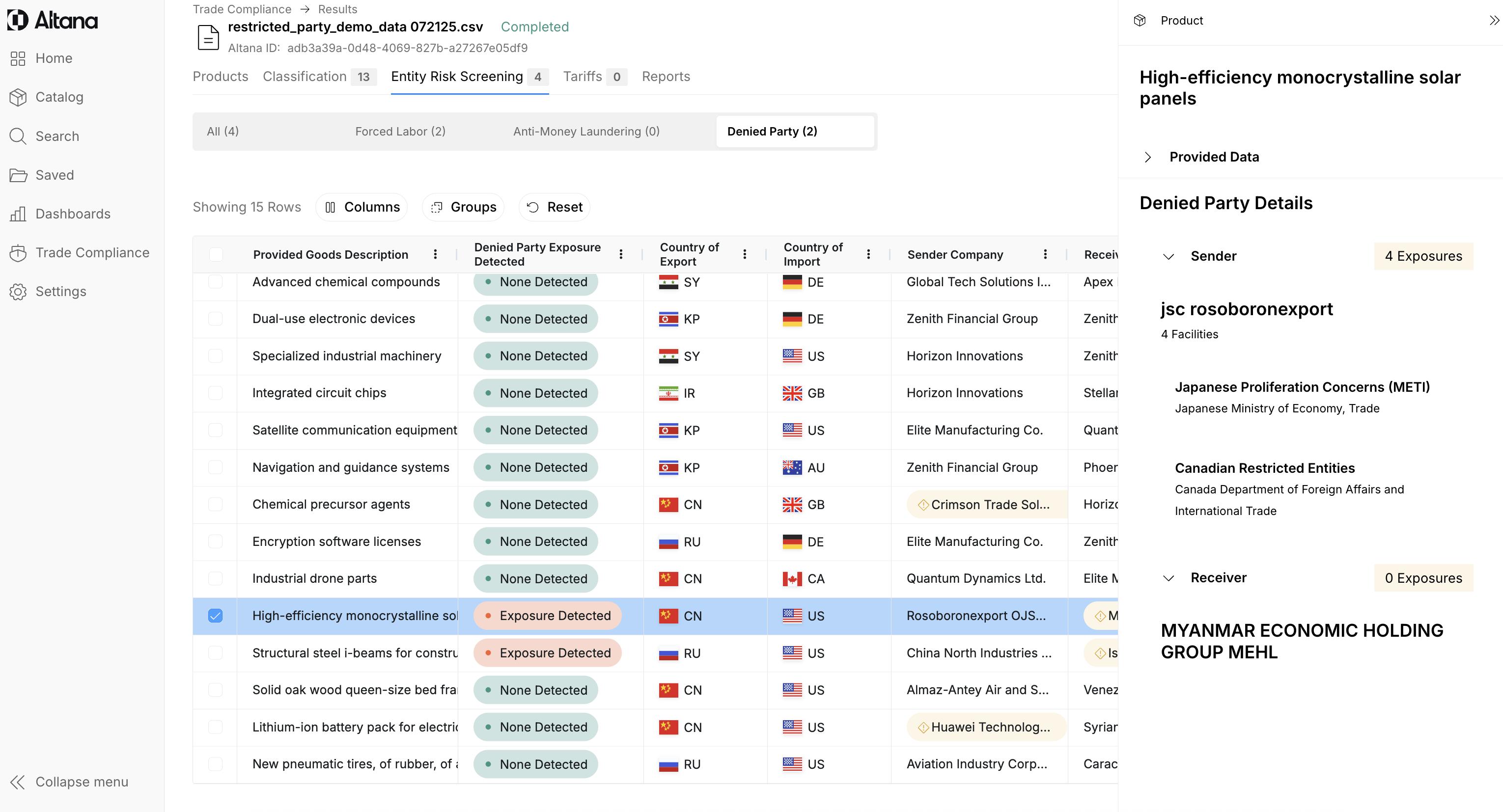 Unlike Forced Labor and Anti-Money Laundering, which trace exposures through the upstream value chain, Denied Party screening is limited to the sender and receiver. This also supports export control screening. For each flagged party, you’ll see the specific list and issuing authority they were matched against.