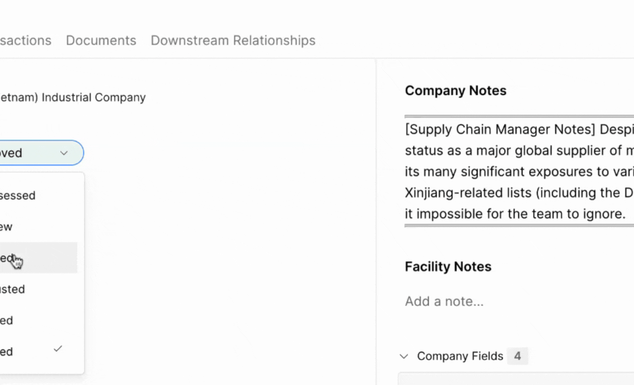Step 1: Select a supplier from the filtered list. Group the selection by company name and triage if a risk score is applied.