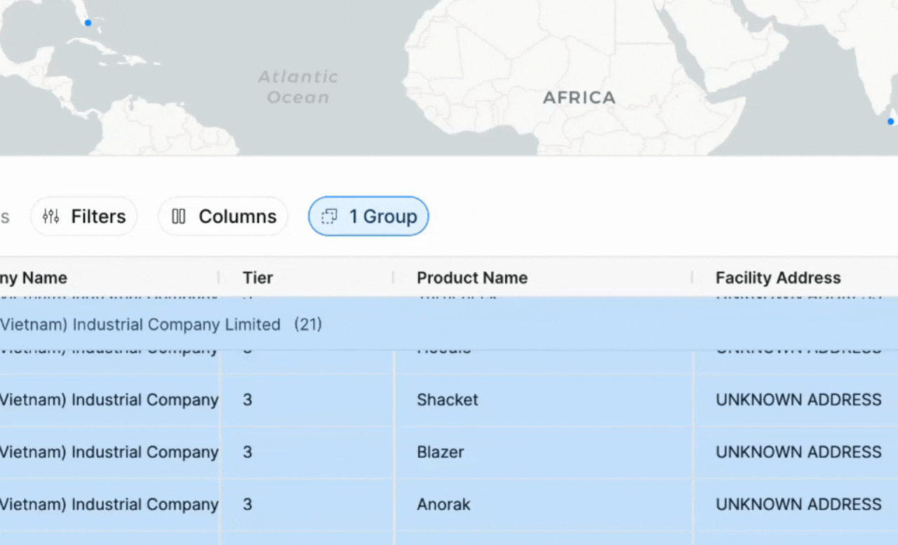 Step 2: Filter the table by tier one supplier and by finished product to customize the risk profile for specific vendors and products.