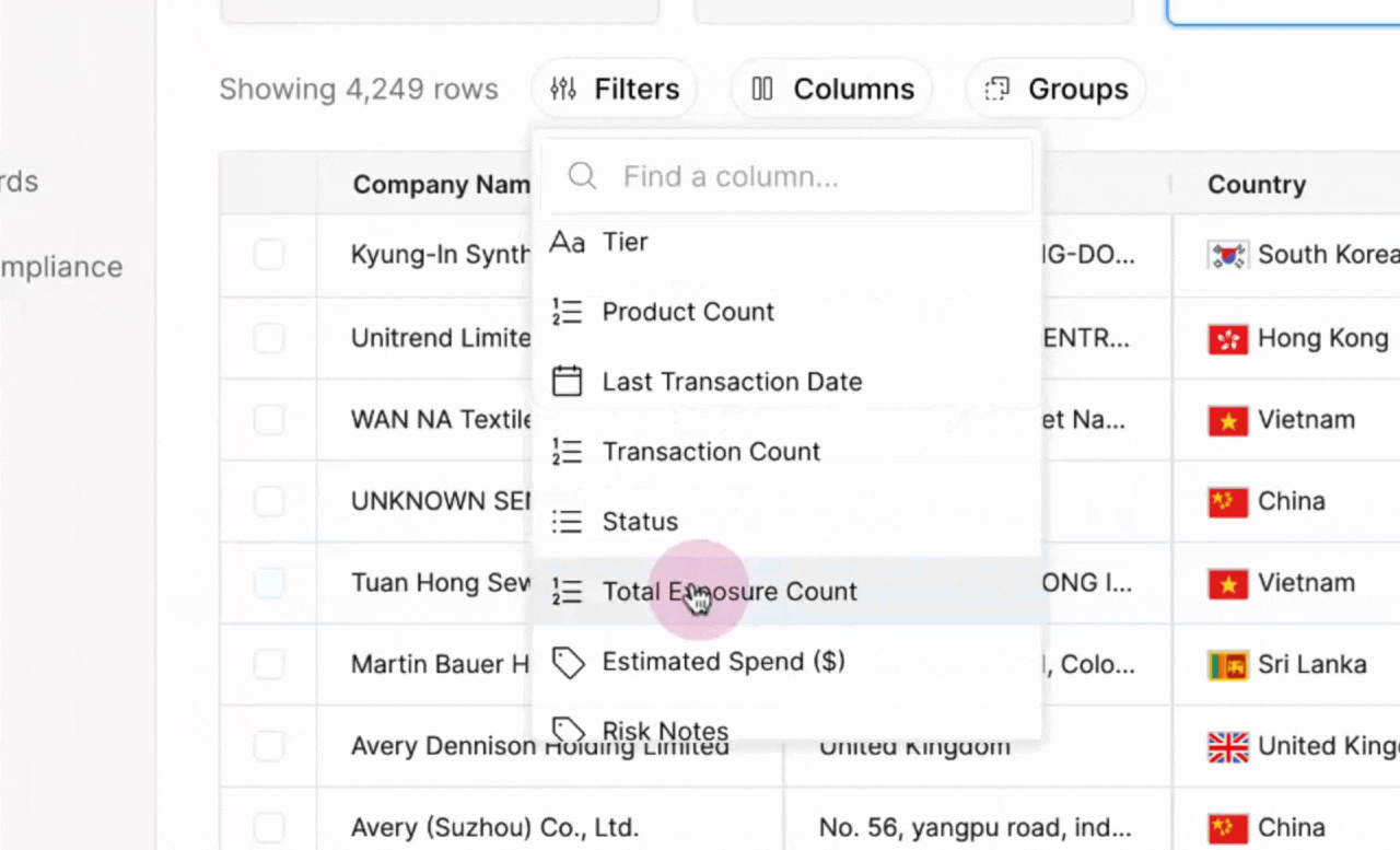 Step 2: Apply a filter to see the total exposure count. This filter automatically includes any supplier from the product catalog with an exposure.